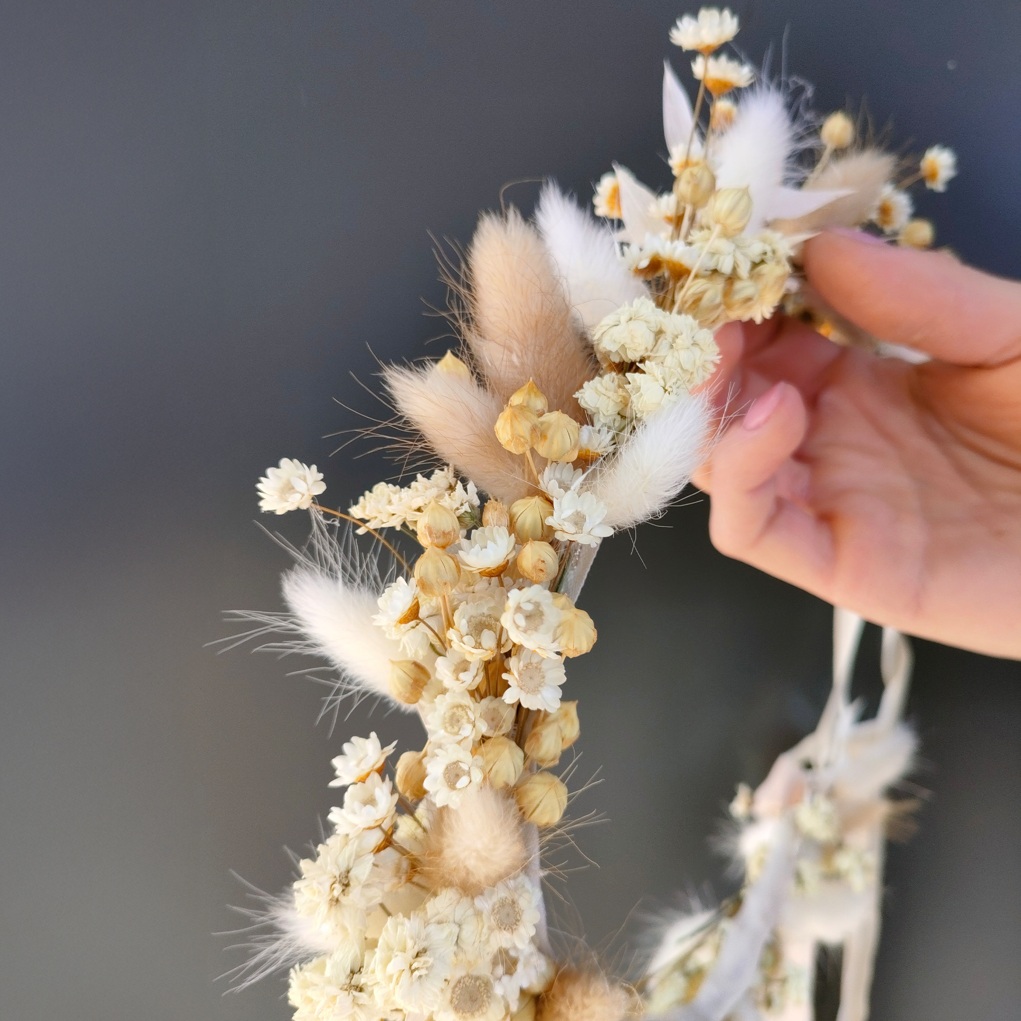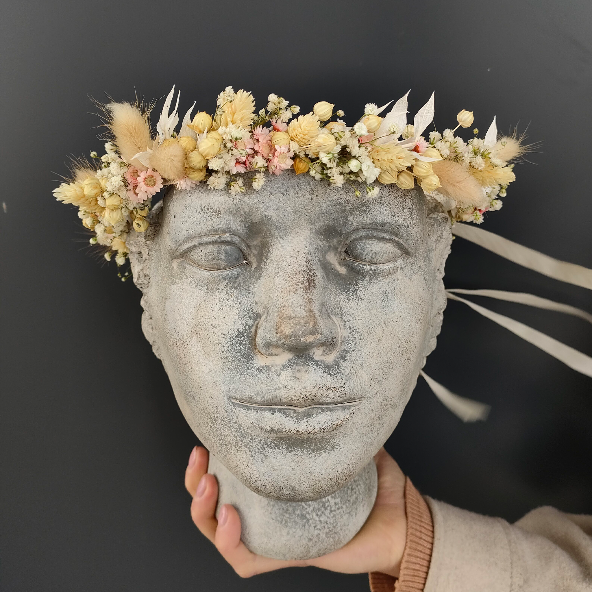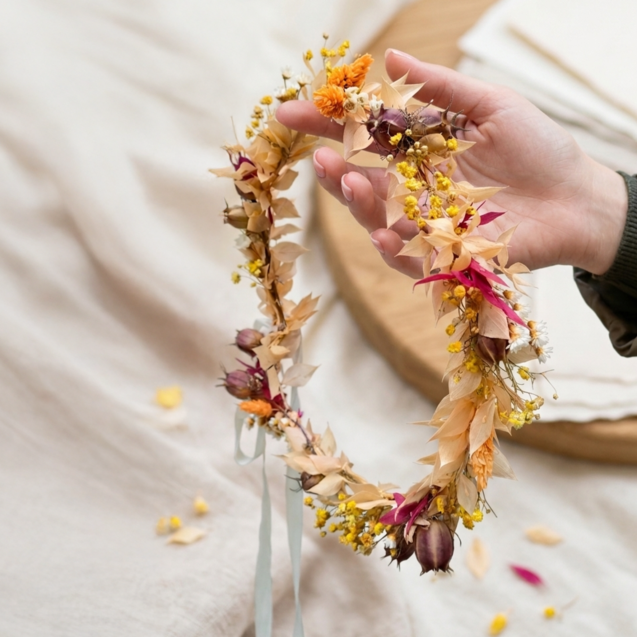 Flower crowns made of dried flowers are a unique accessory for many occasions. They are popular for photo shoots, weddings, hen parties, communions, festivals, outdoor events and family sessions. They are also a beautiful styling element for children and adults.