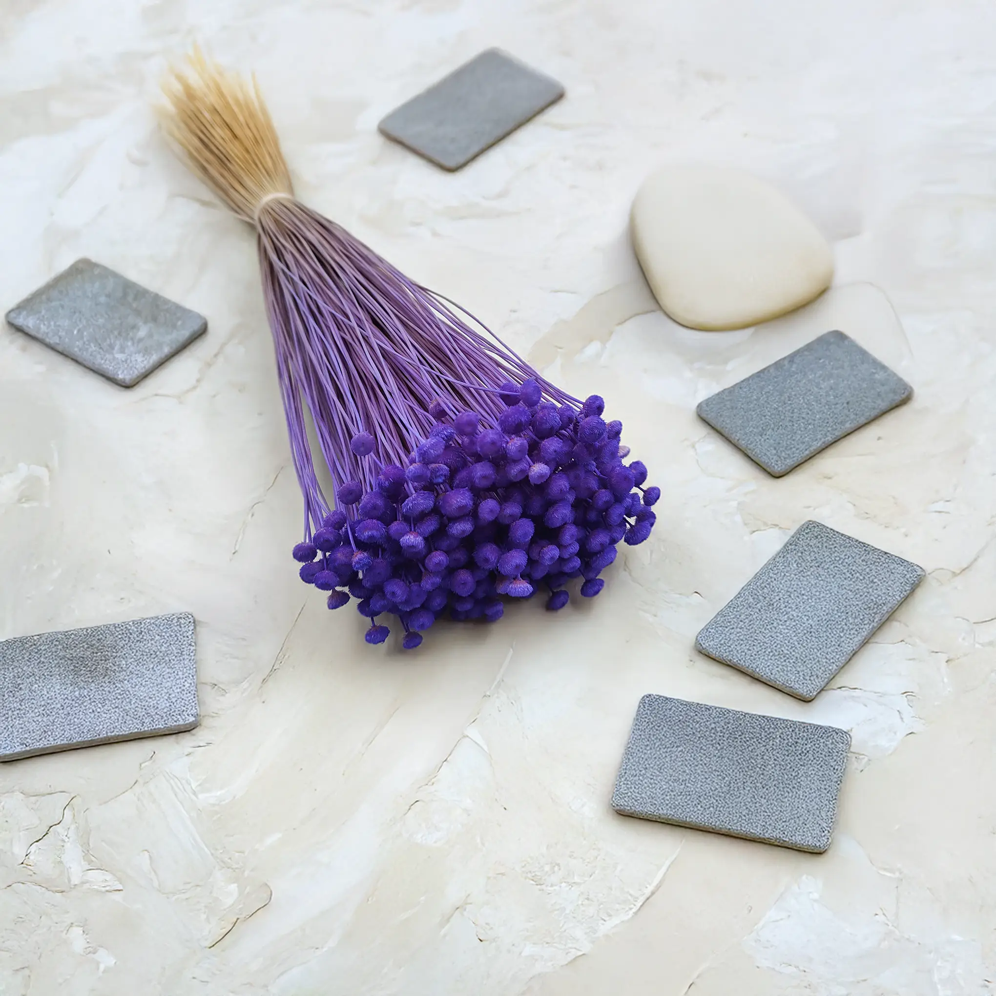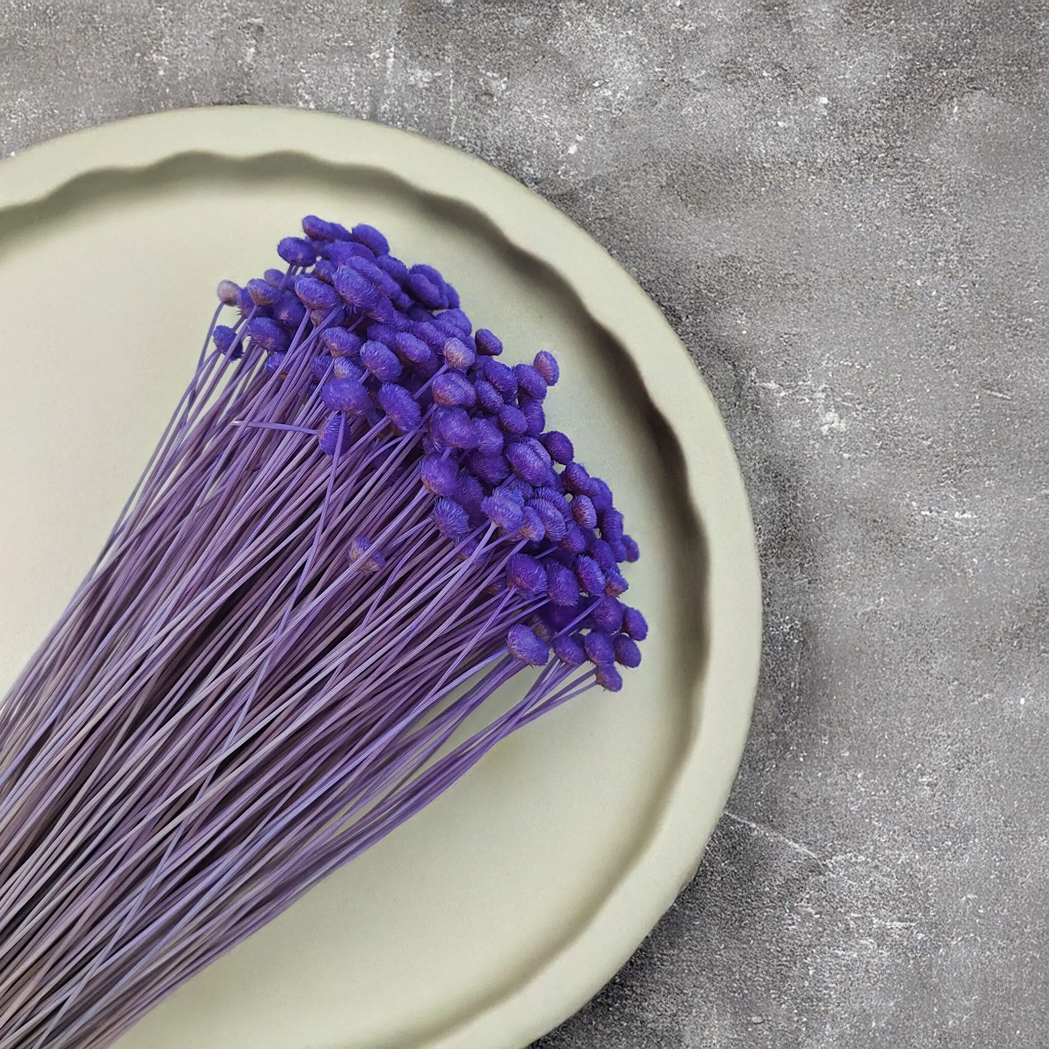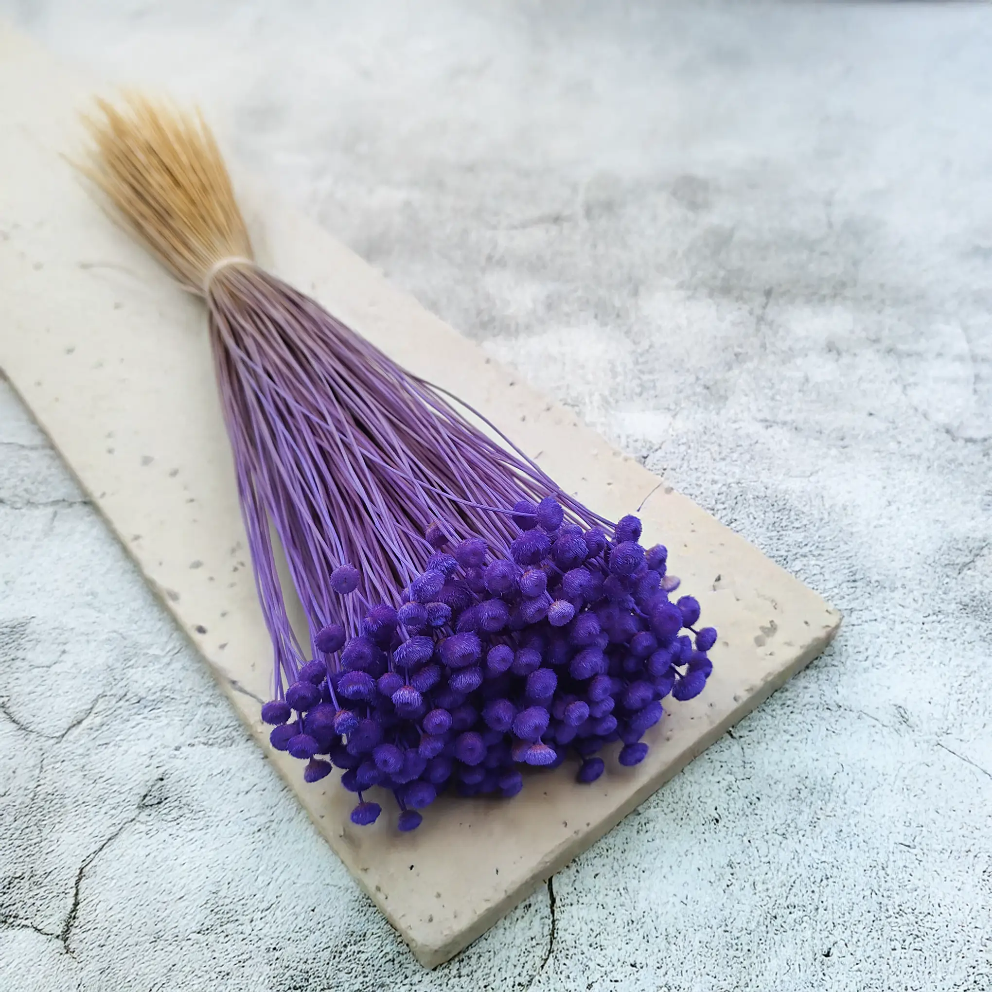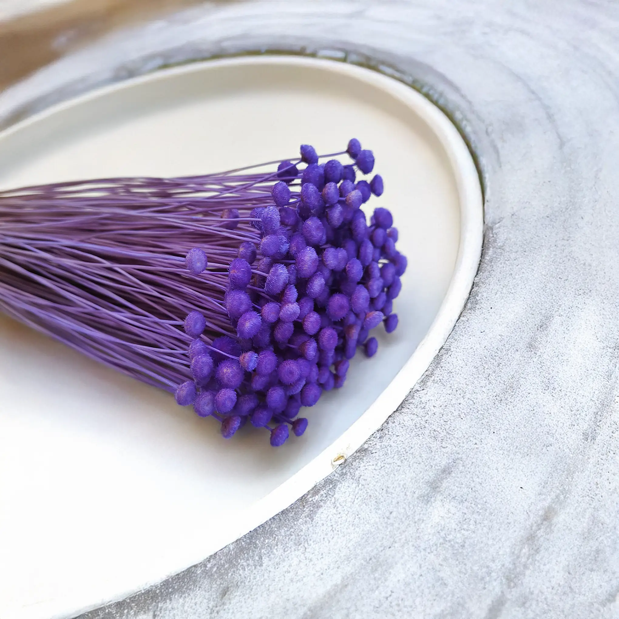 Botao Amarelino in a deep cornflower violet tone is a stunning dried flower featuring round, compact blooms. Originally from South America, it has been carefully dried and dyed to preserve its color and texture.