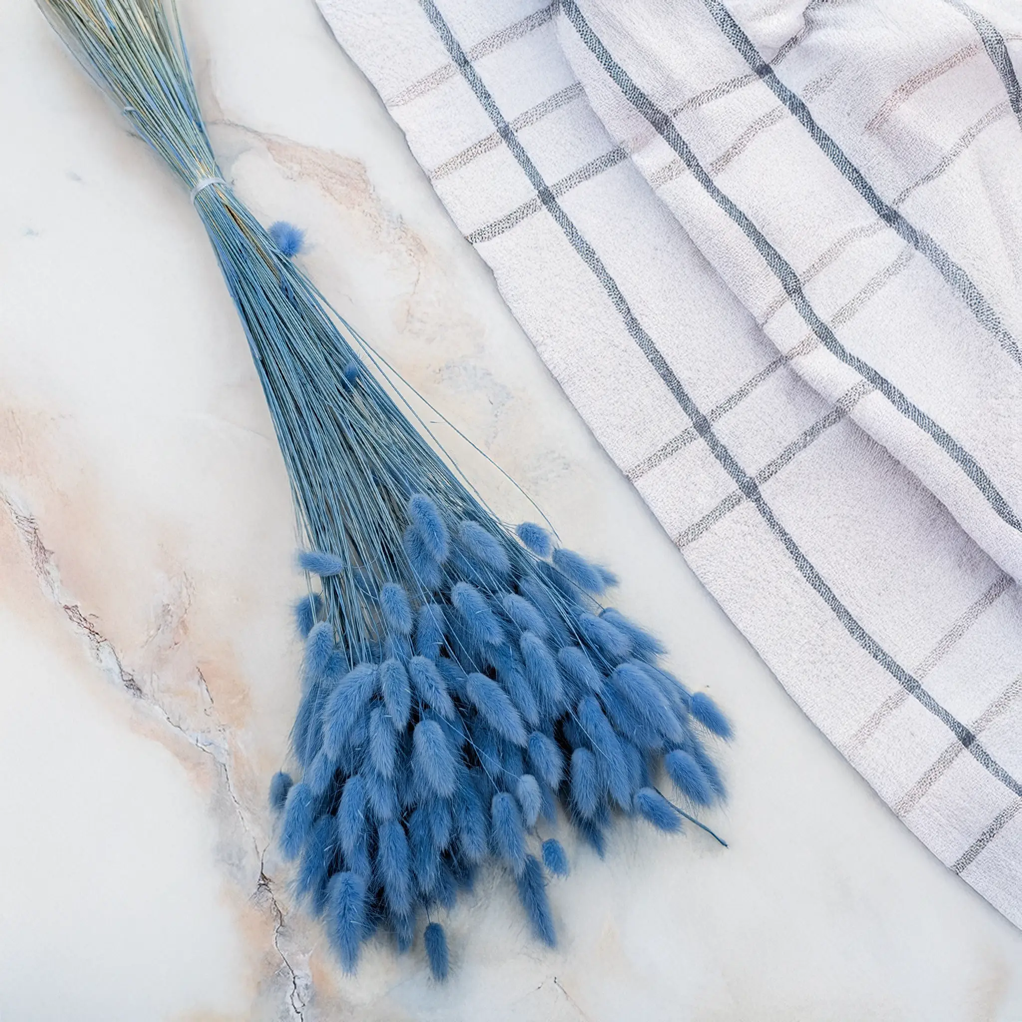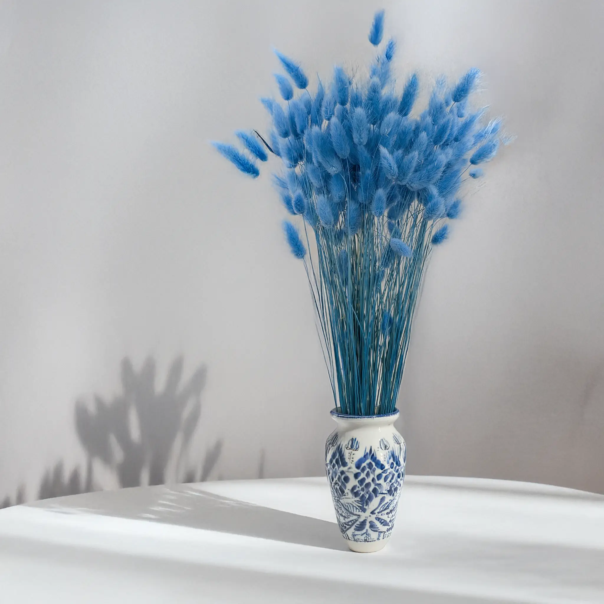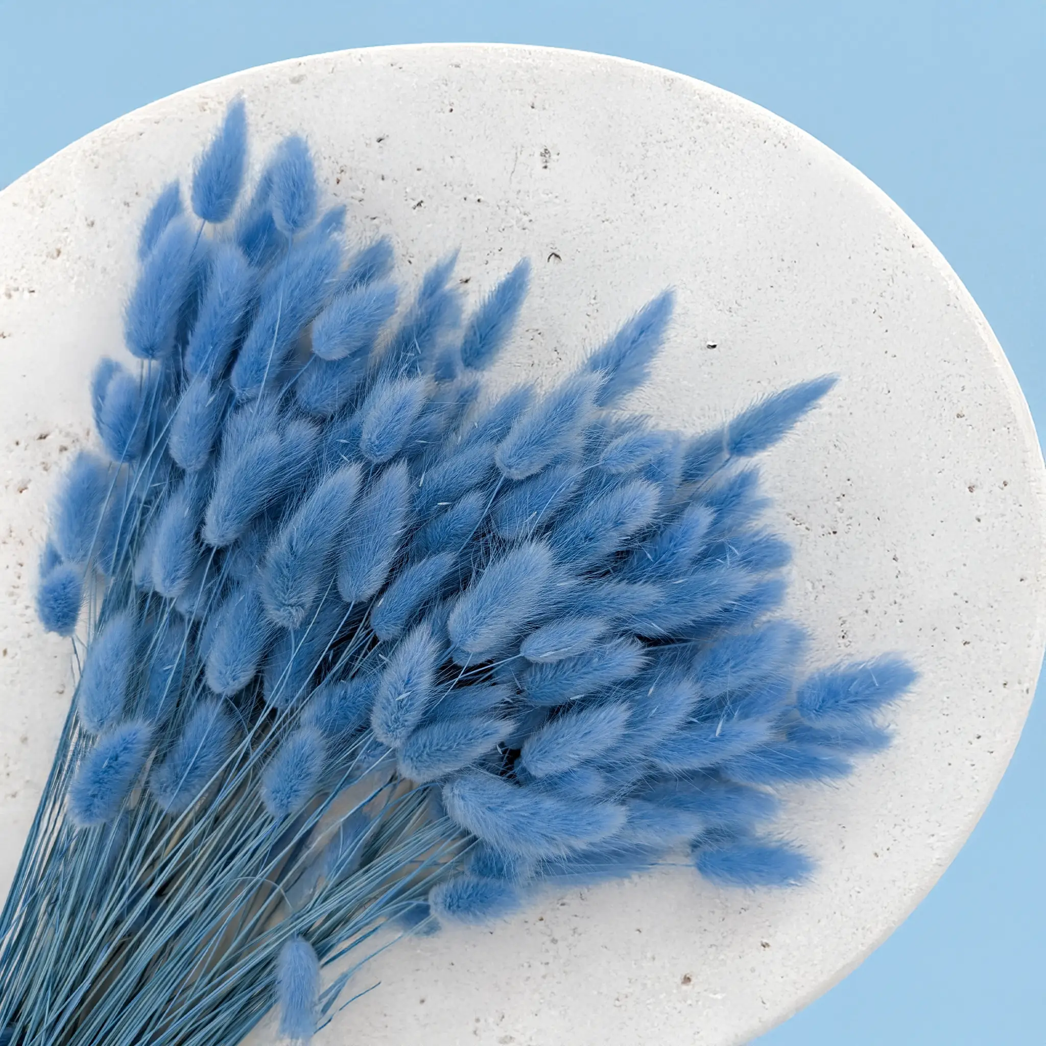 Azure dried Bunny Tails bring tropical freshness and vibrant charm to any floral display. With a bold, sky-blue hue and fluffy texture, they are ideal for modern arrangements, beach-themed weddings, and uplifting decor. Their airy form adds movement, while the intense color works beautifully as an accent in bouquets, boxes, and garlands.
