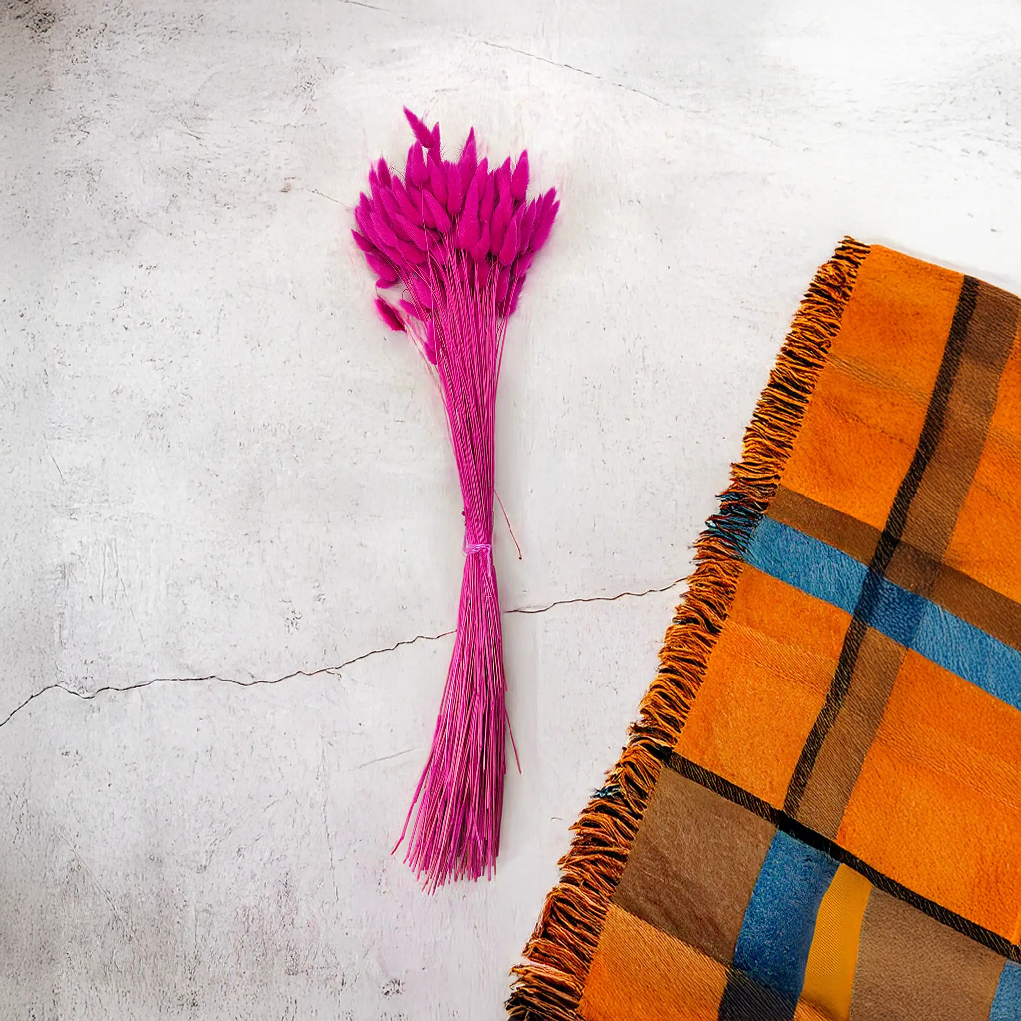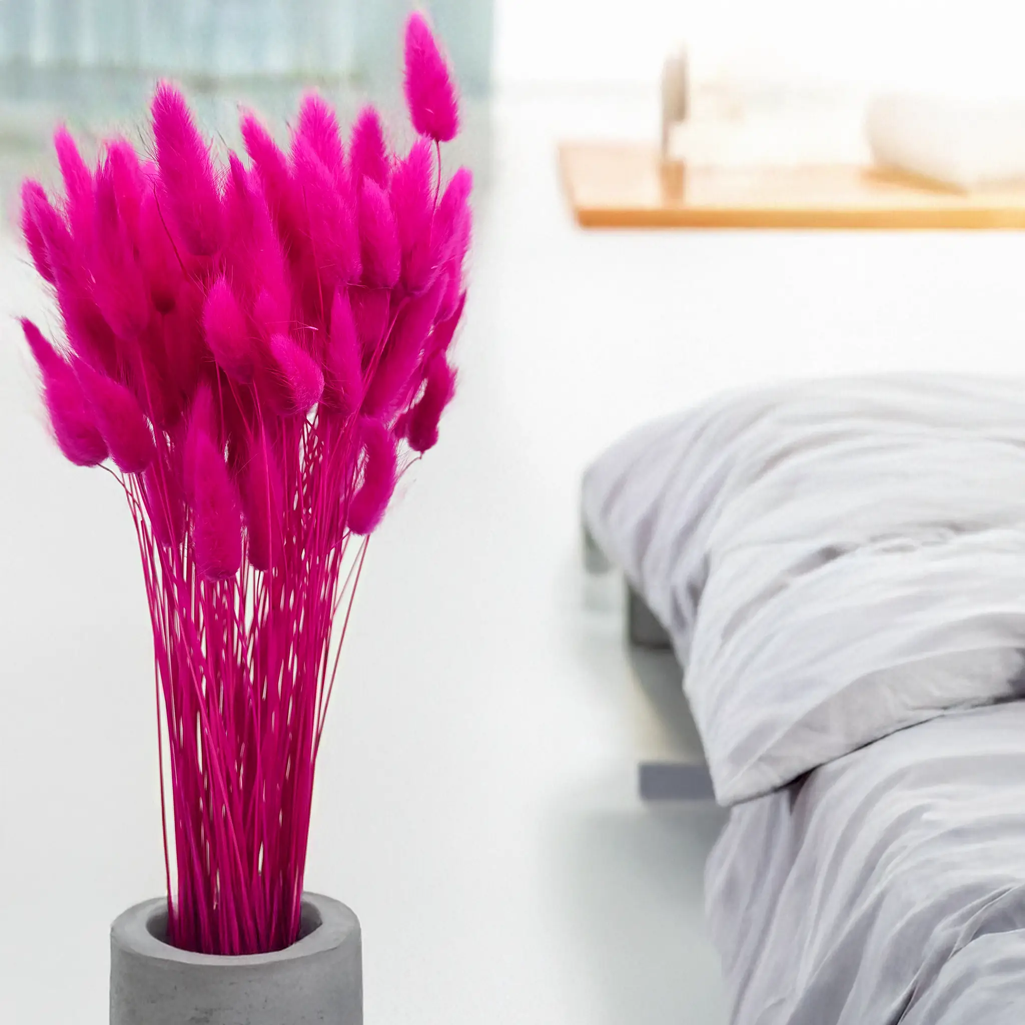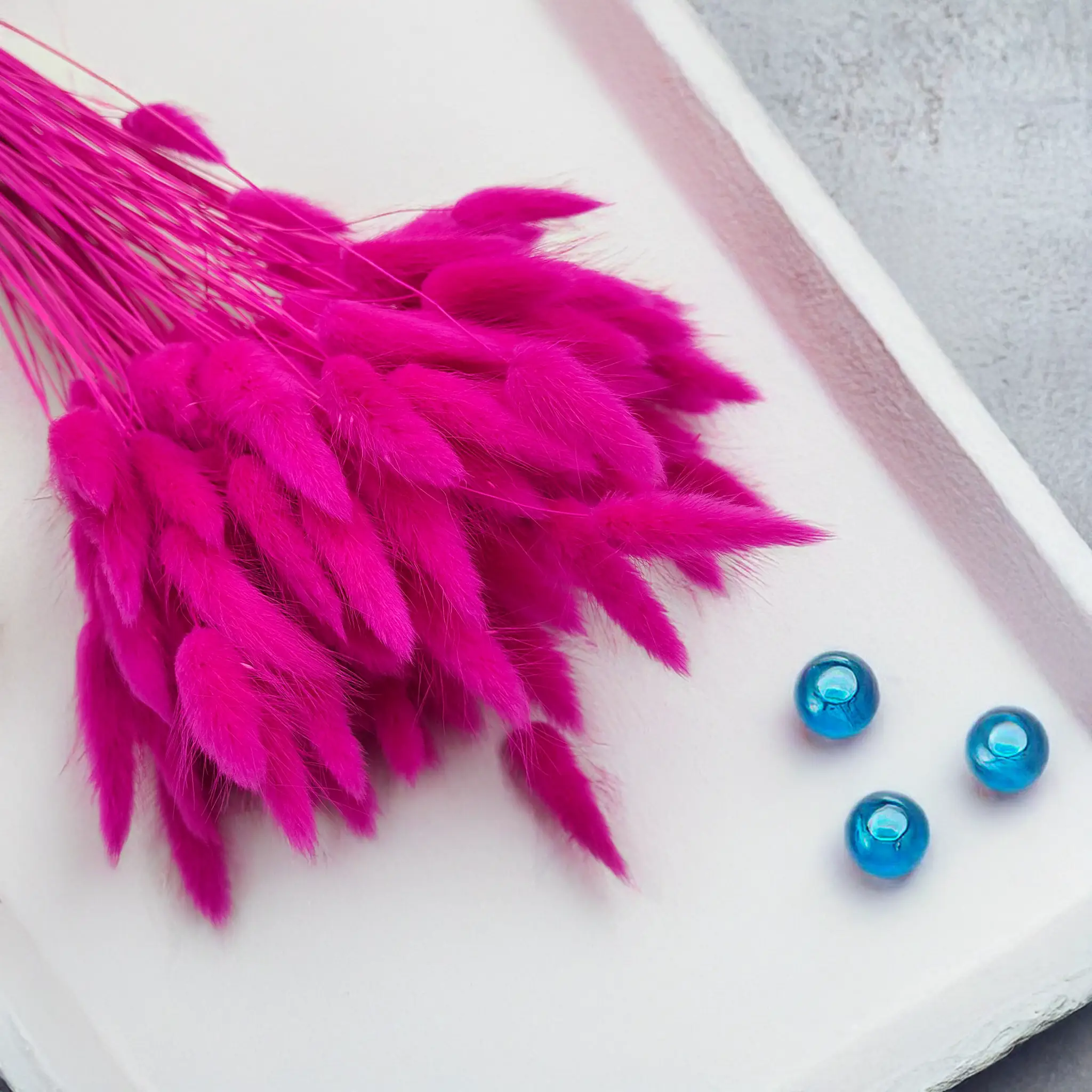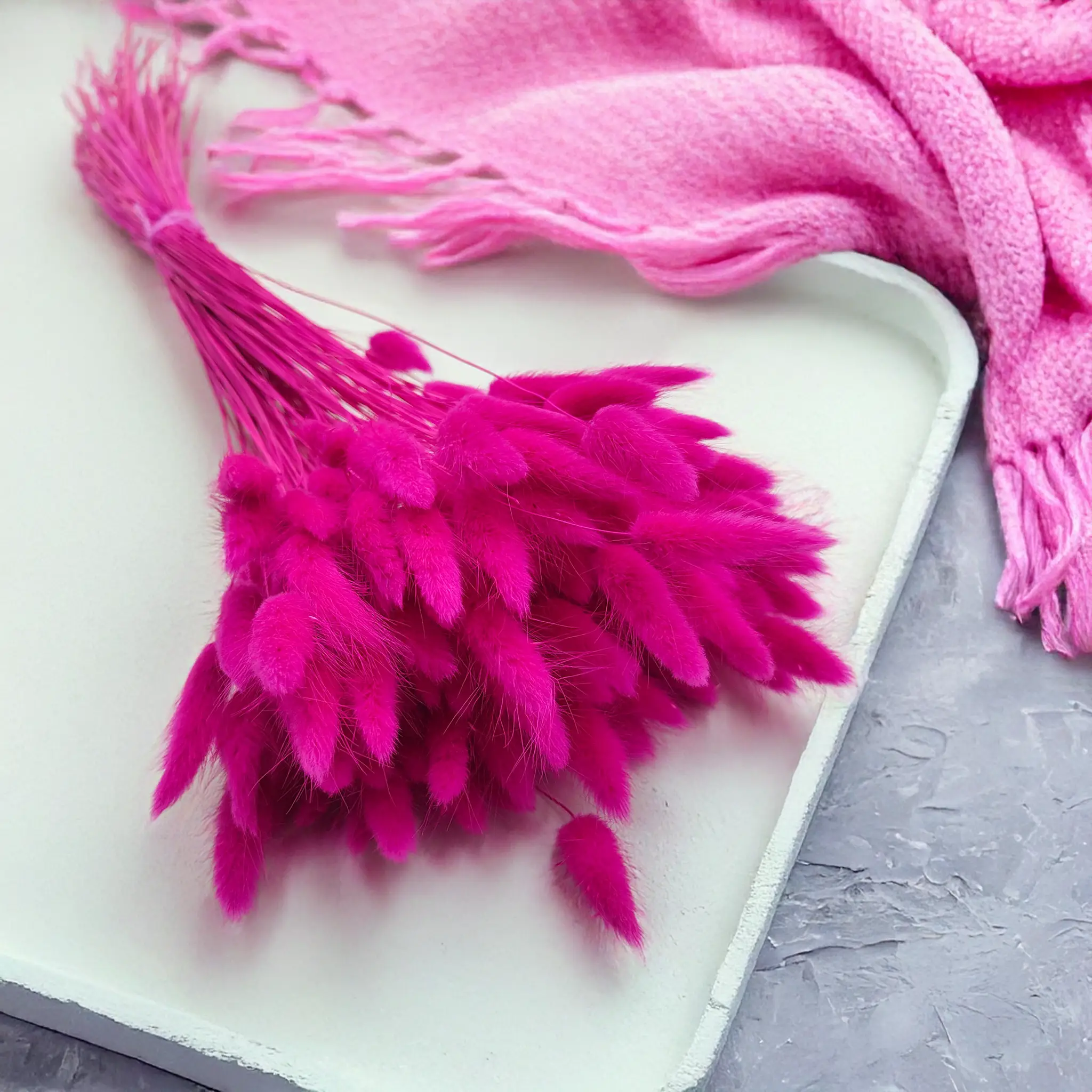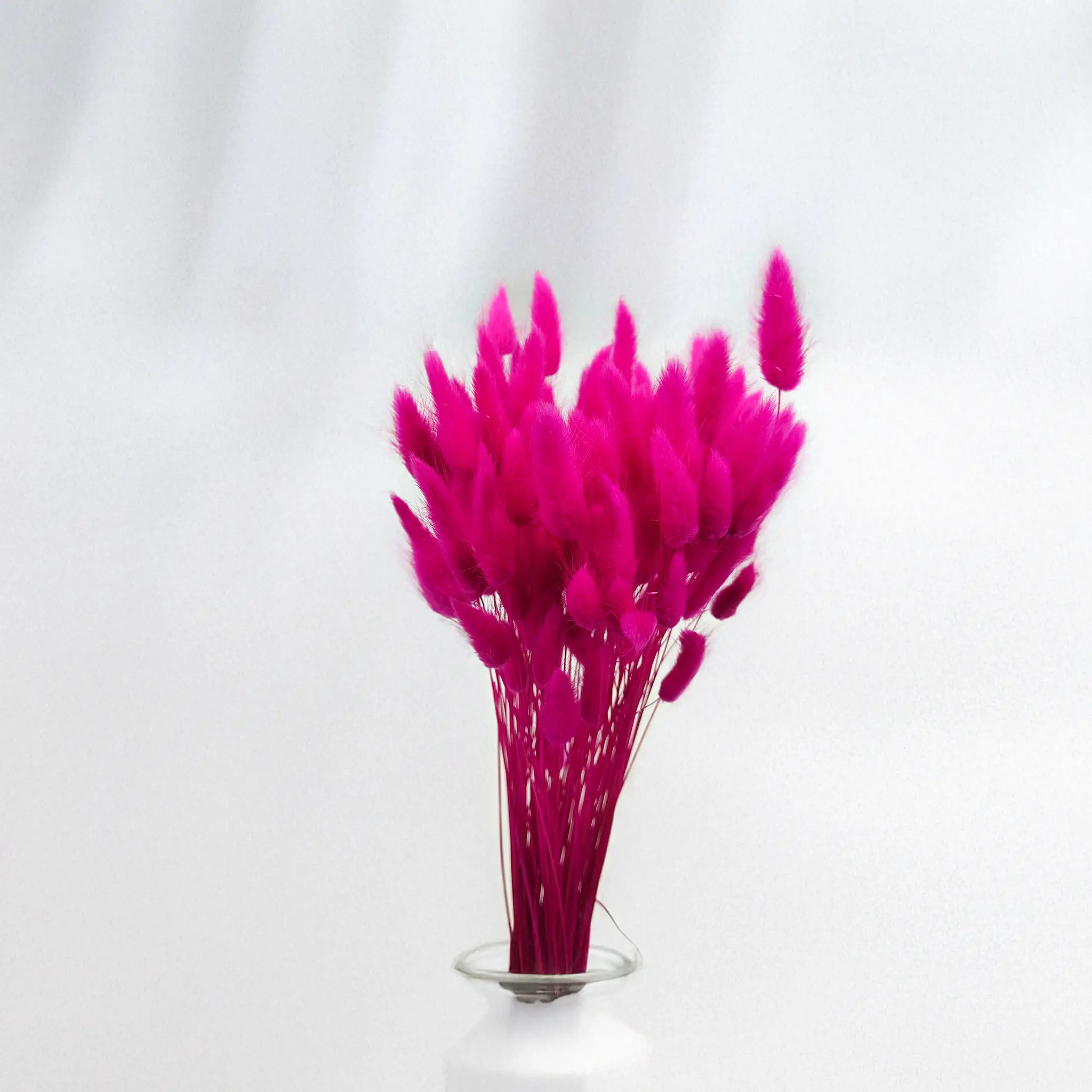 Fuchsia dried Lagurus (Bunny Tails) is a bold and vibrant floral accent. This striking pinkish-purple hue represents passion, femininity and creativity – perfect for modern designs, events and expressive interiors. Its fluffy texture and vivid color bring drama and energy to any arrangement.