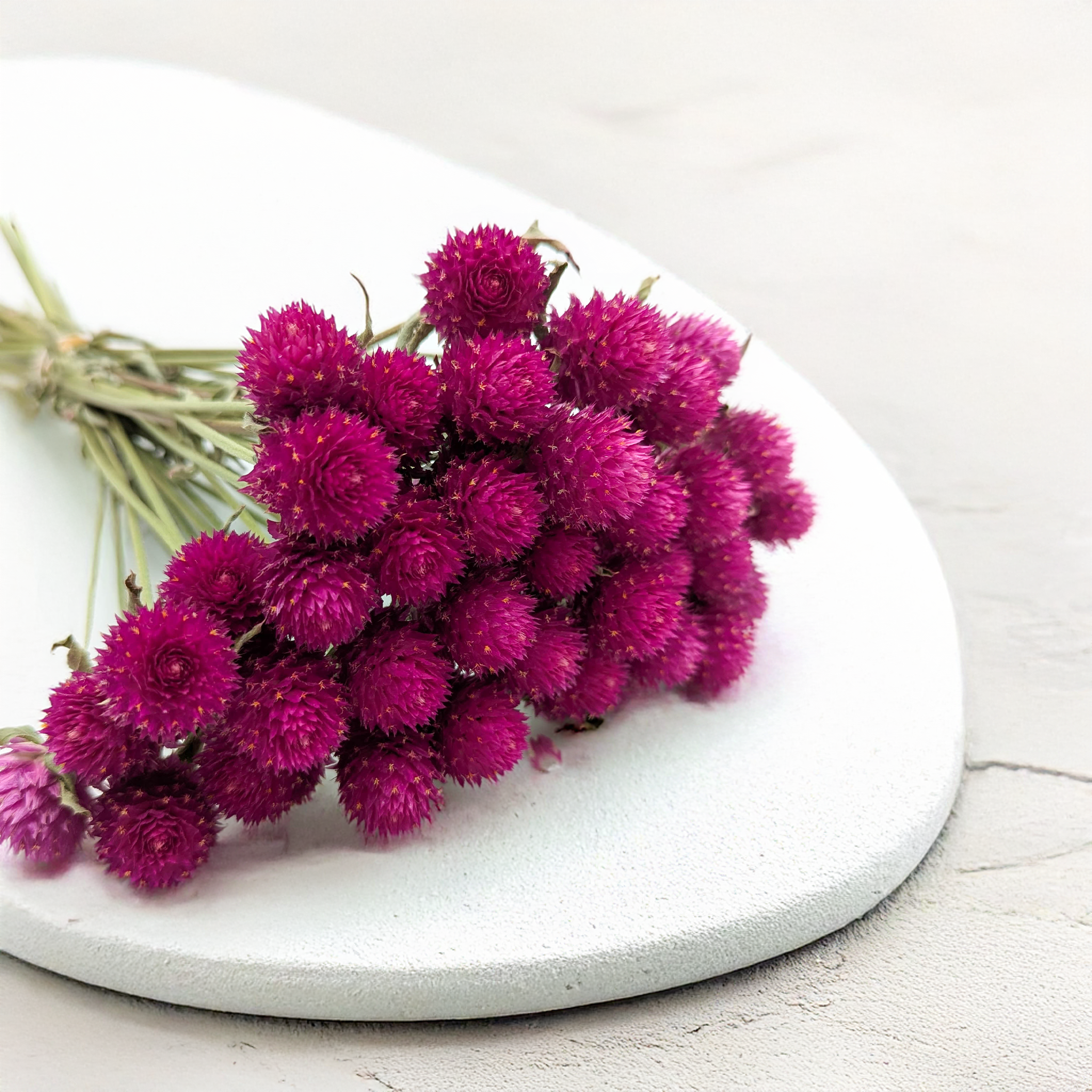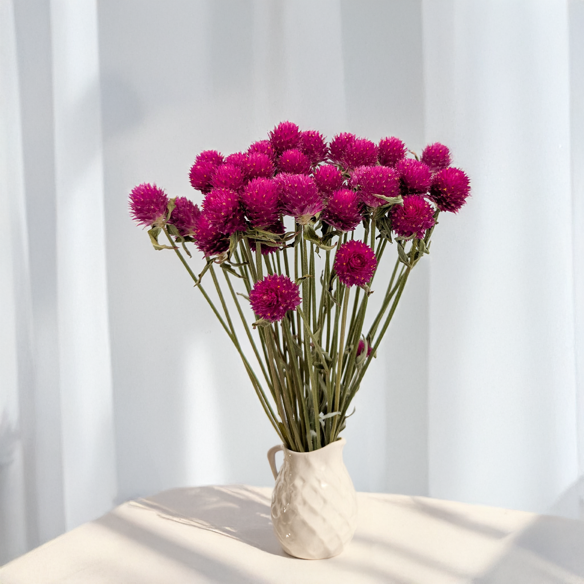 Pink dried Globe Amaranth bouquet is a bold and vibrant floral element. Its strong pink color brings energy and character to arrangements. Stripped of leaves, it is ready to use immediately, while the drying process preserved its natural form and vivid shades.