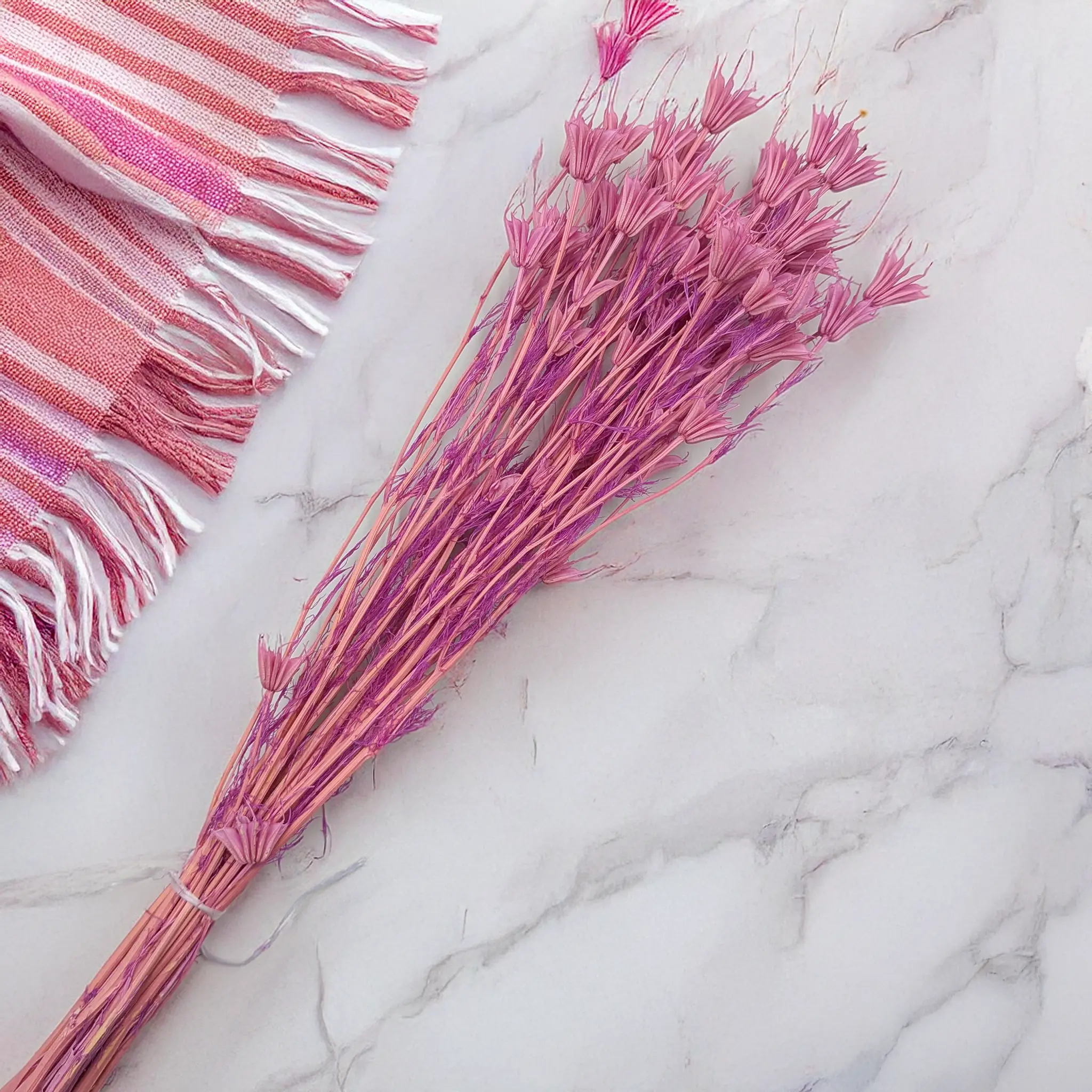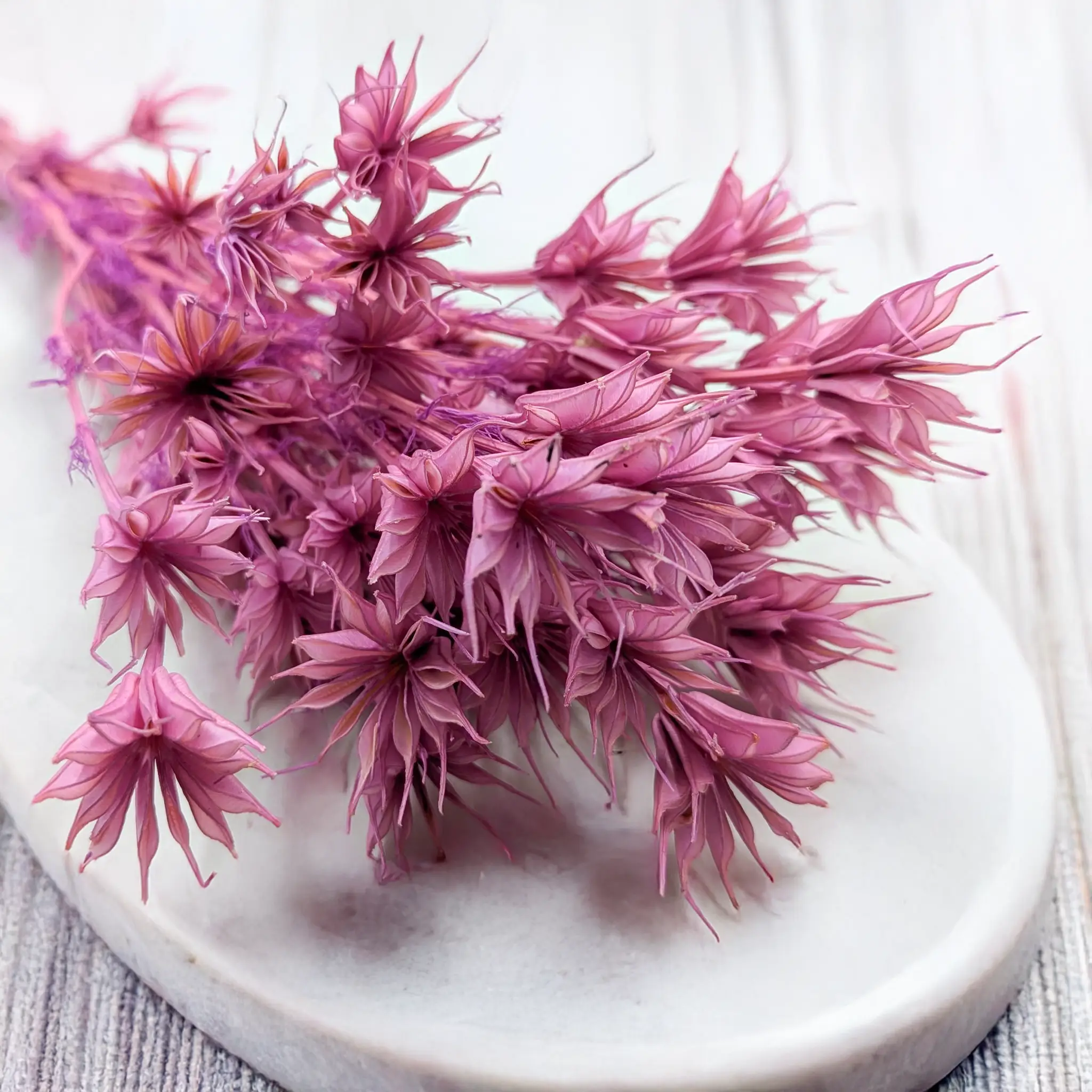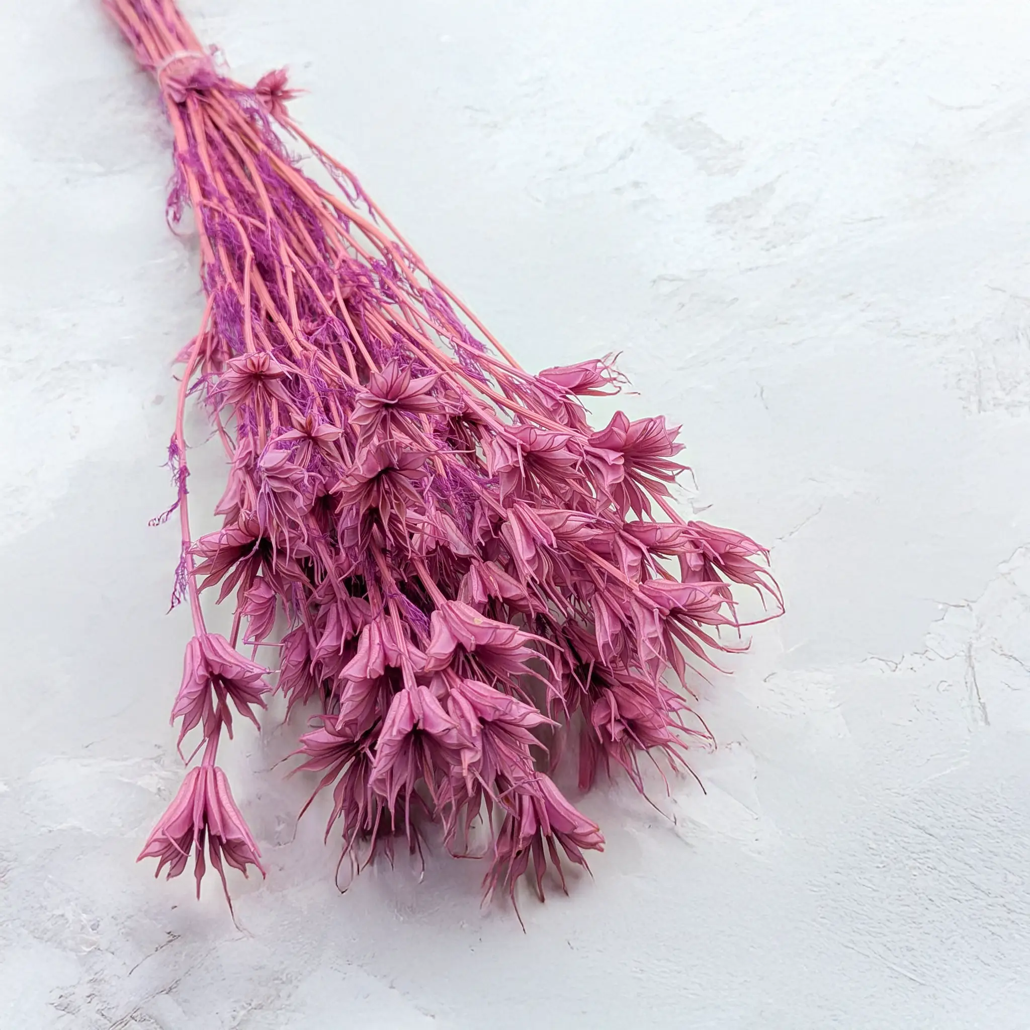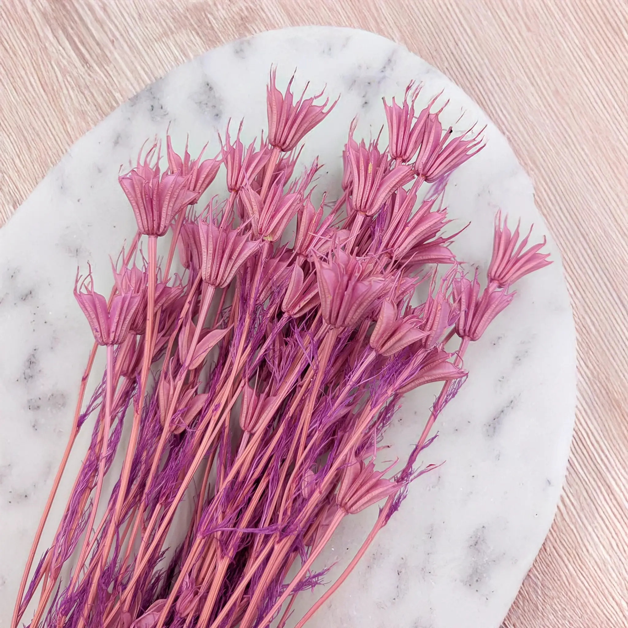 Lilac Nigella works beautifully in wedding bouquets, table décor, interior arrangements and event floristry. It suits romantic, vintage, boho and glamour compositions. Perfect alongside dried roses, eucalyptus, lagurus, glixia and pampas grass to add subtle colour depth.