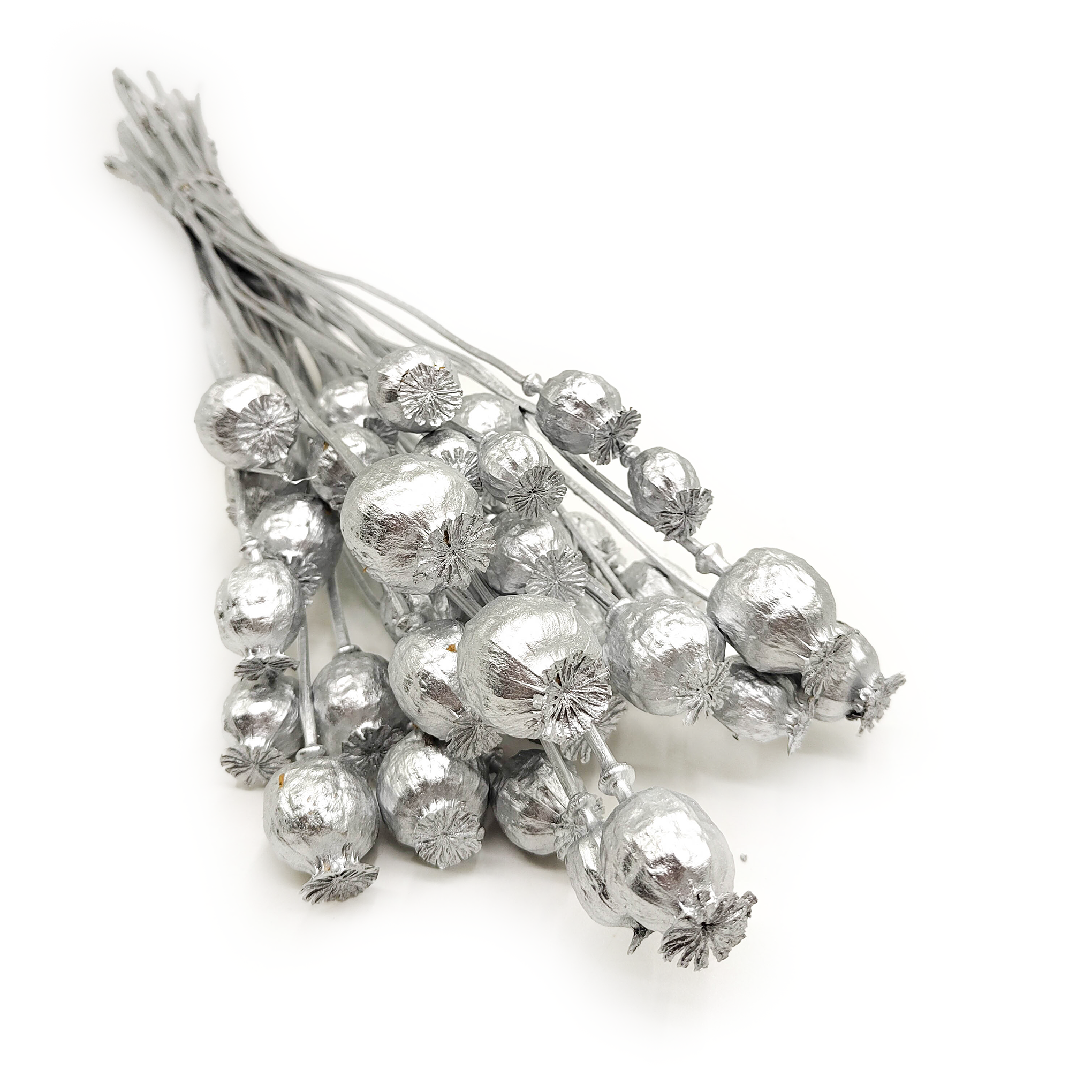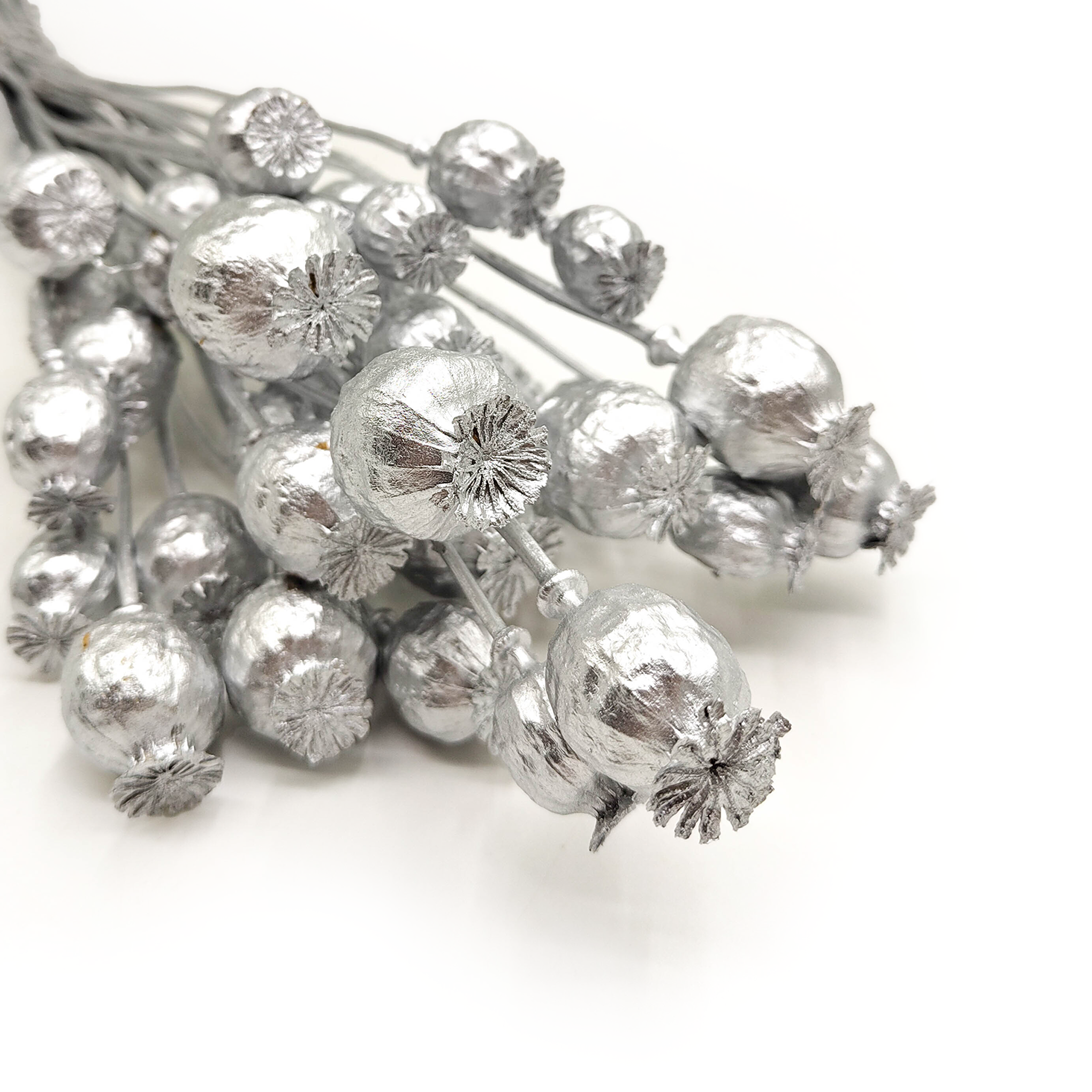 Dried Poppy Pods – Silver are natural poppy heads, hand-painted in an elegant cool silver shade. This unique decorative material combines an organic botanical form with a modern metallic finish. Perfect for festive arrangements, seasonal floristry and interior decoration.