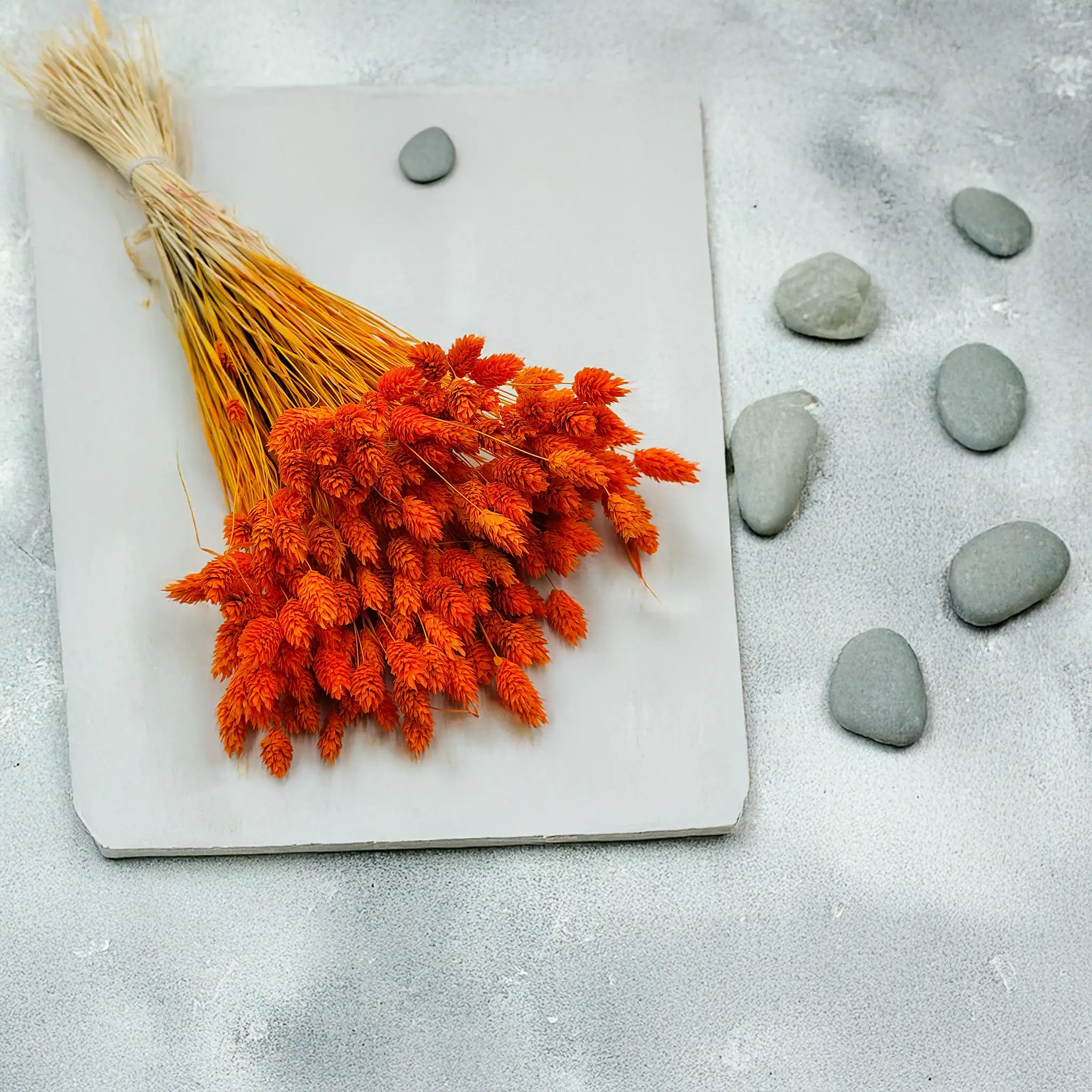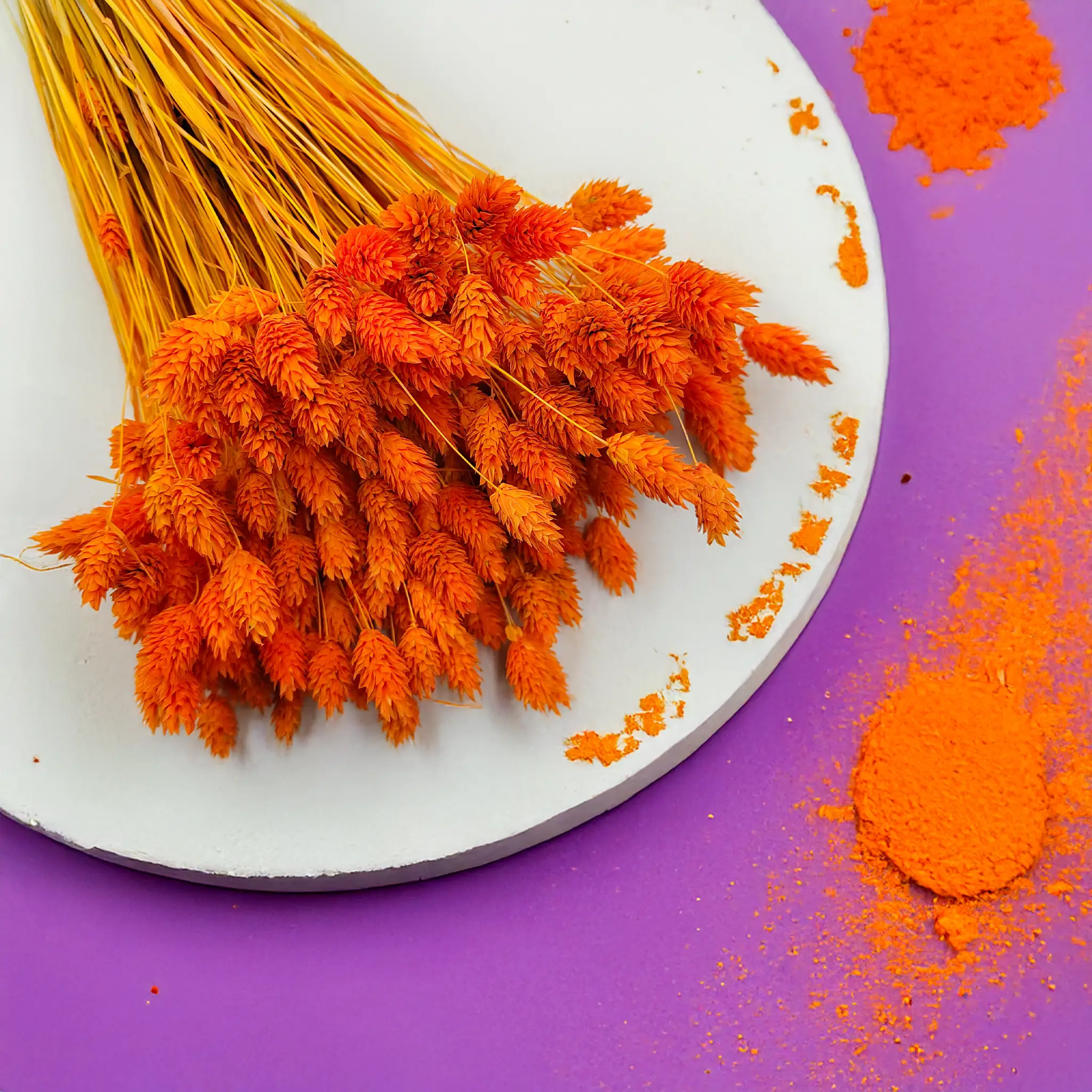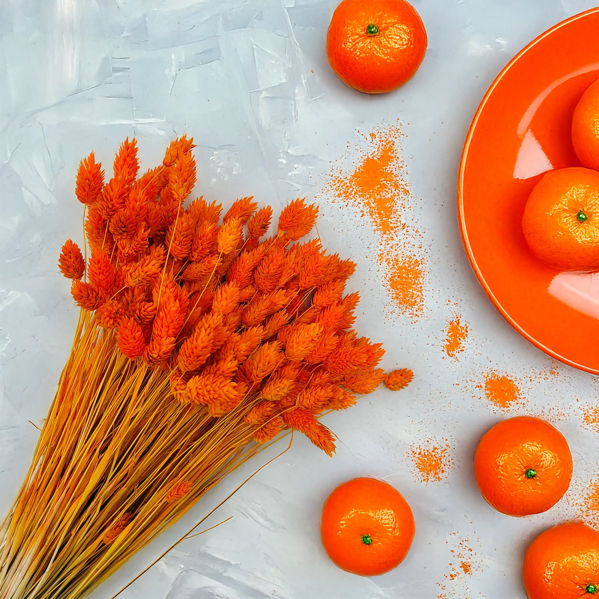 Tangerine Phalaris is a vibrantly dyed version of Canary Grass (Phalaris Canariensis) – an ornamental grass native to the Mediterranean and Canary Islands. This plant is known for its dense, spike-shaped flower heads that retain their structure and durability for months after drying. In this version, it stands out with a warm and saturated tangerine hue.