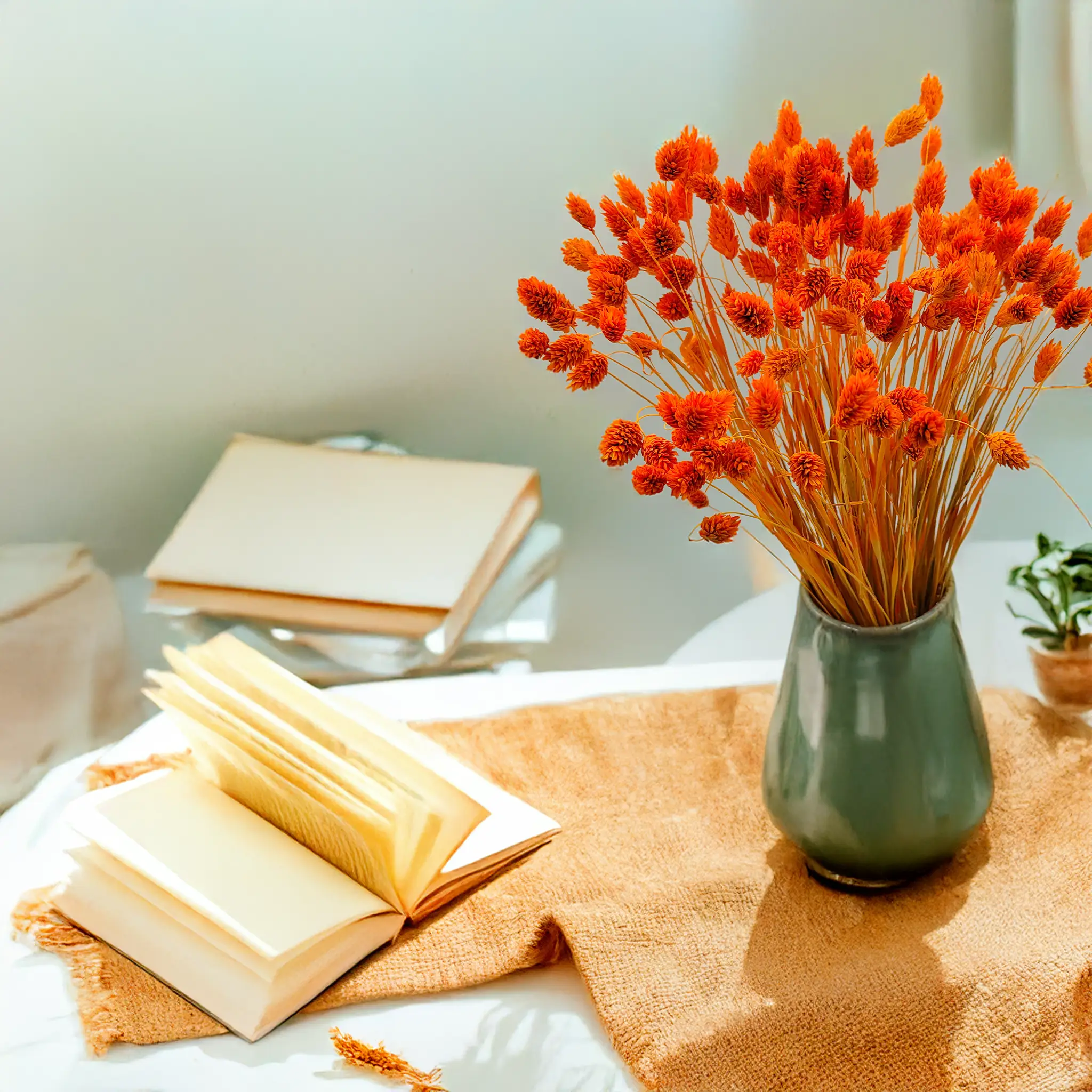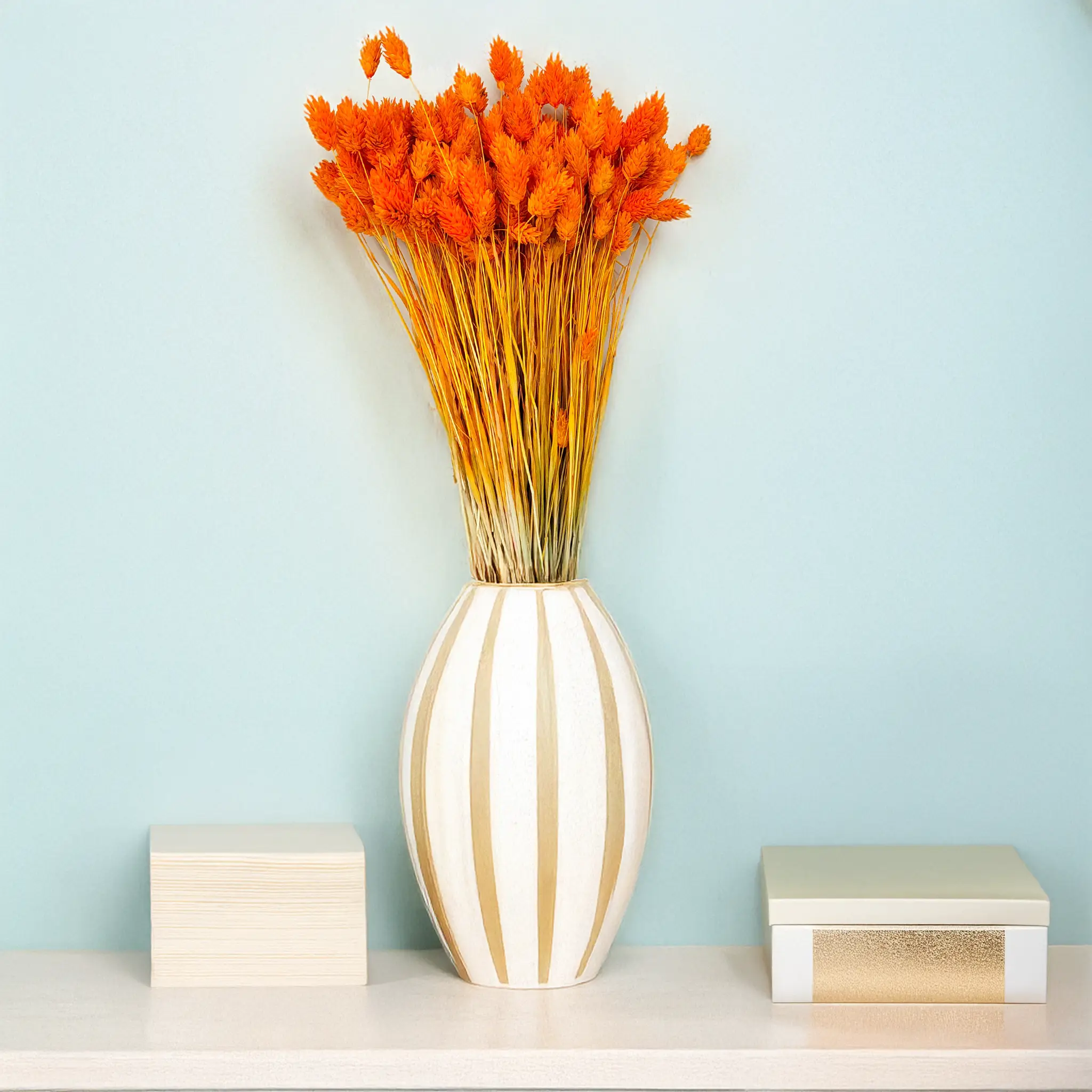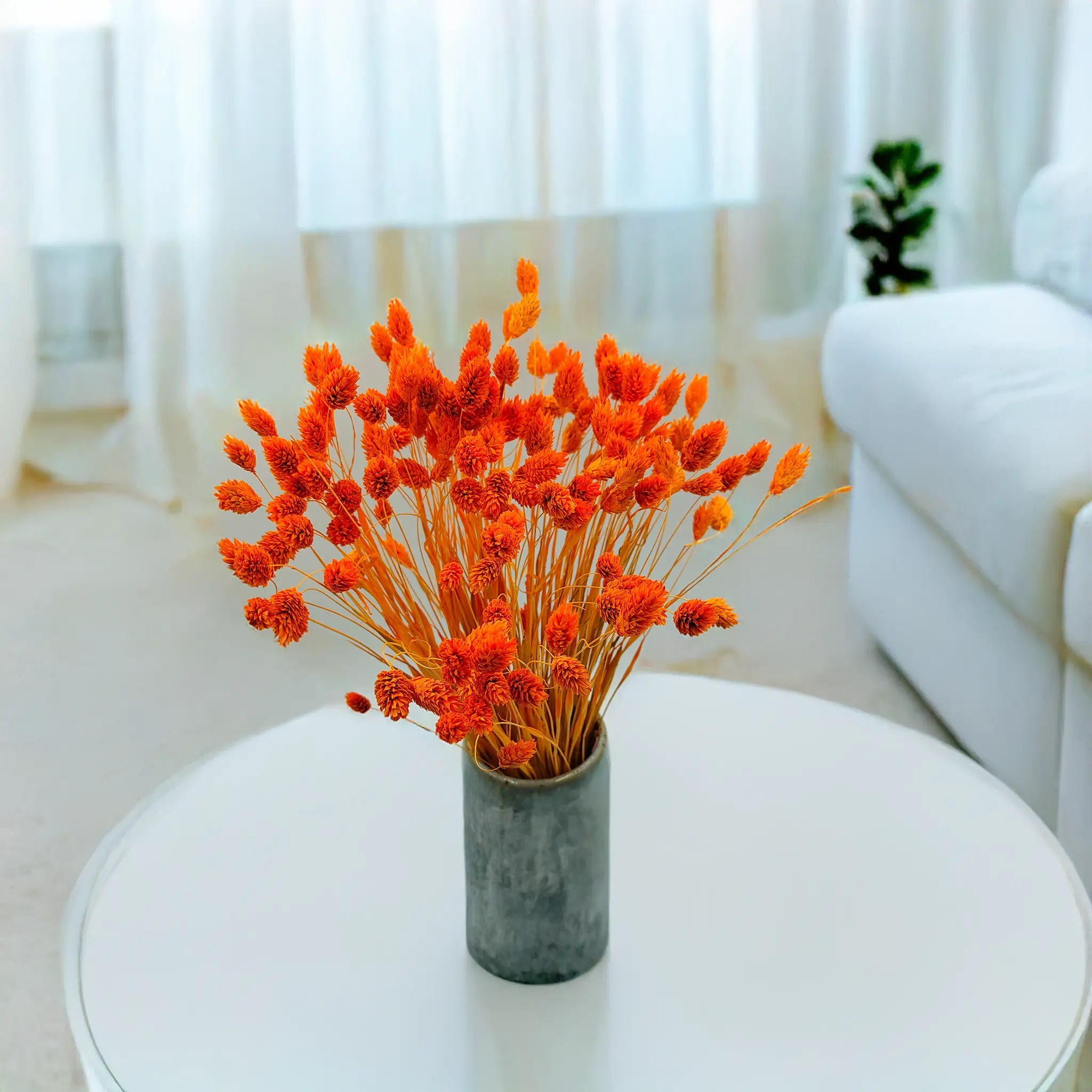 Tangerine Phalaris is a vibrantly dyed version of Canary Grass (Phalaris Canariensis) – an ornamental grass native to the Mediterranean and Canary Islands. This plant is known for its dense, spike-shaped flower heads that retain their structure and durability for months after drying. In this version, it stands out with a warm and saturated tangerine hue.
