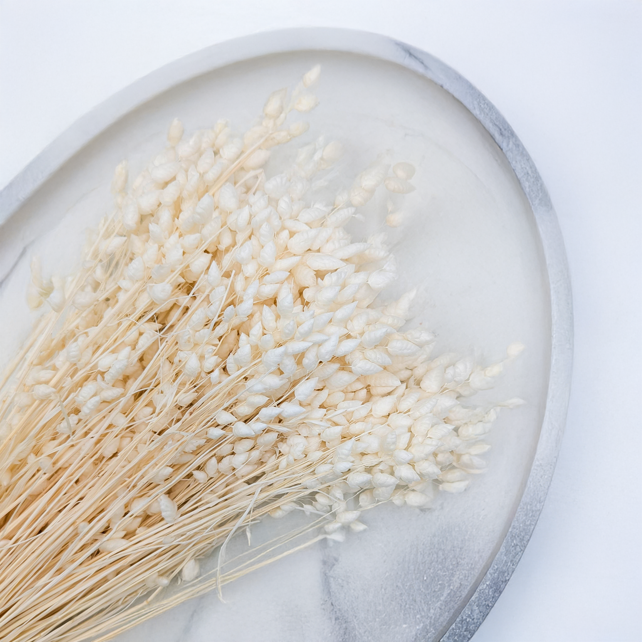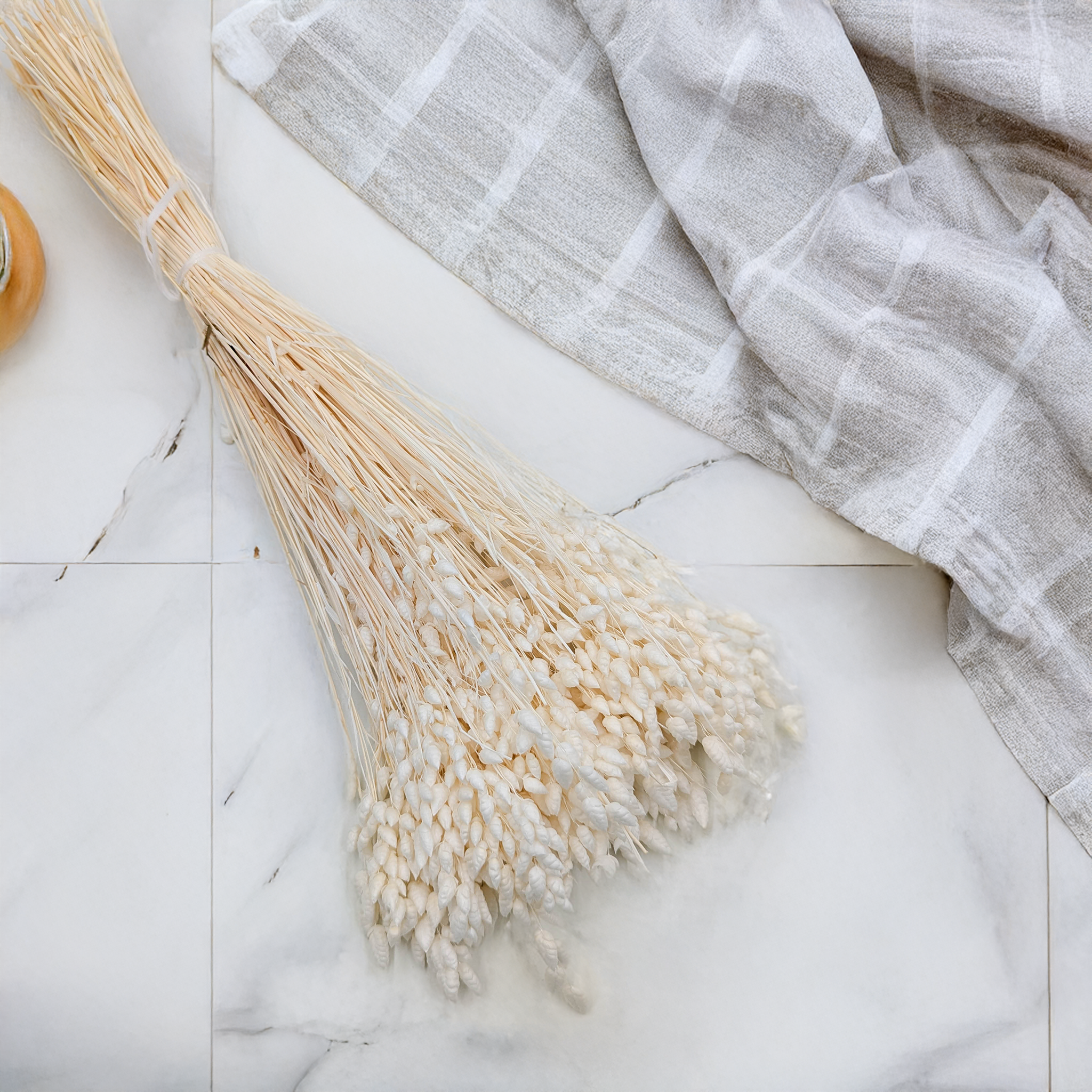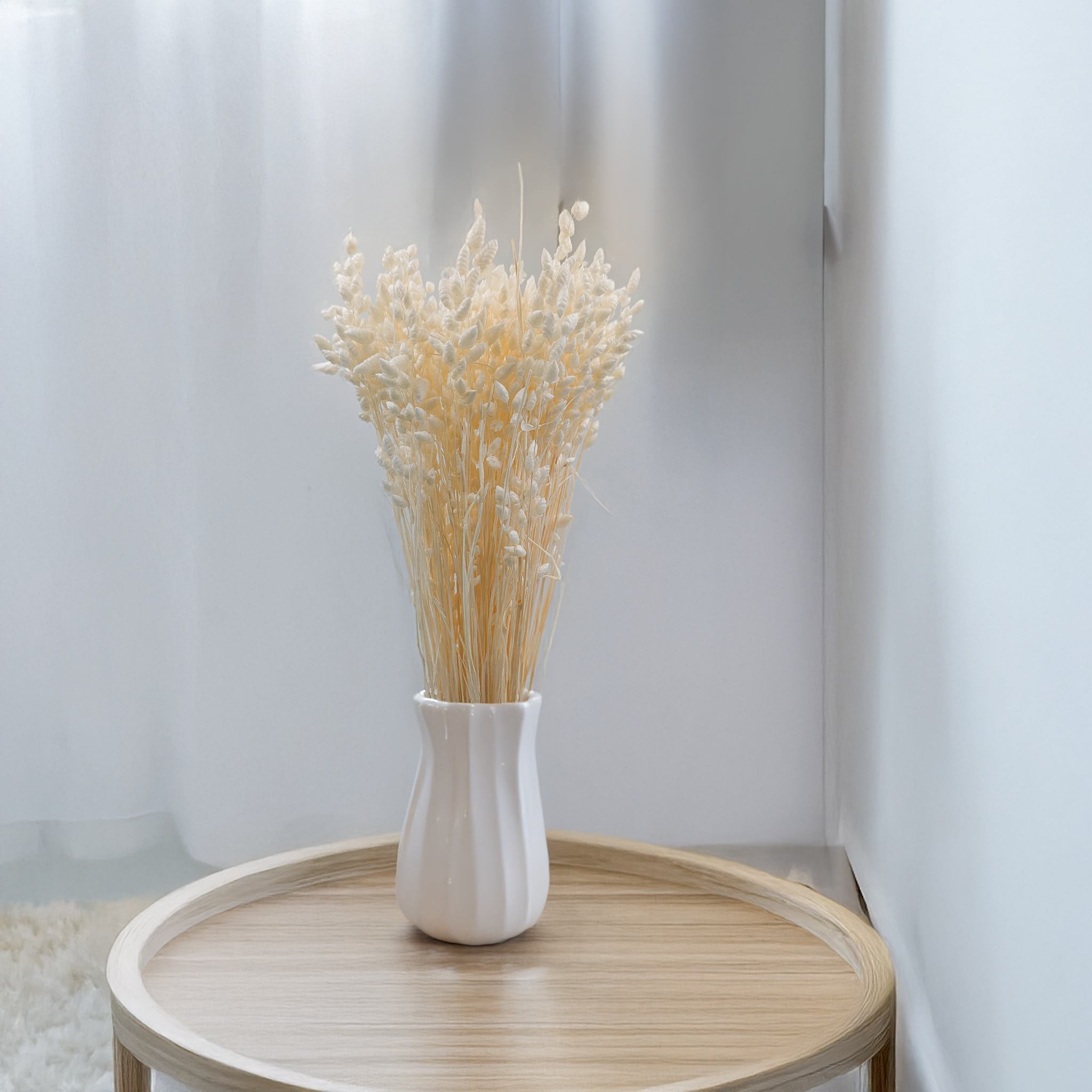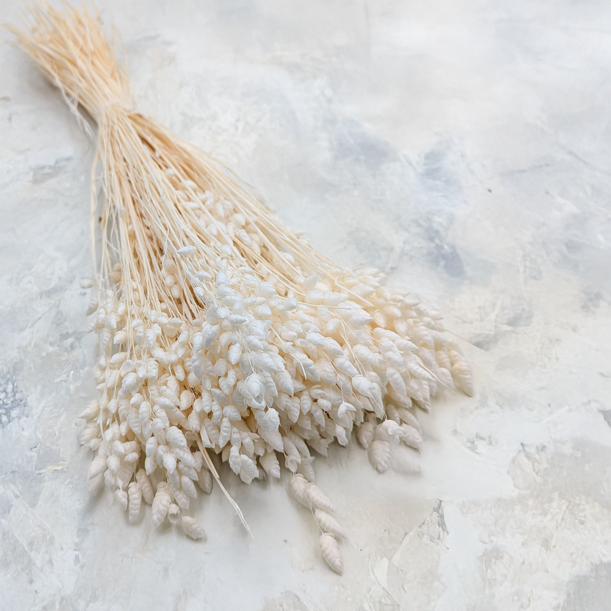 Thanks to its durability and unique appearance, bleached quaking grass is suitable for both everyday interior decorations and special occasions. It can be used independently, creating minimalist yet impressive compositions, or as a part of larger decorative projects.