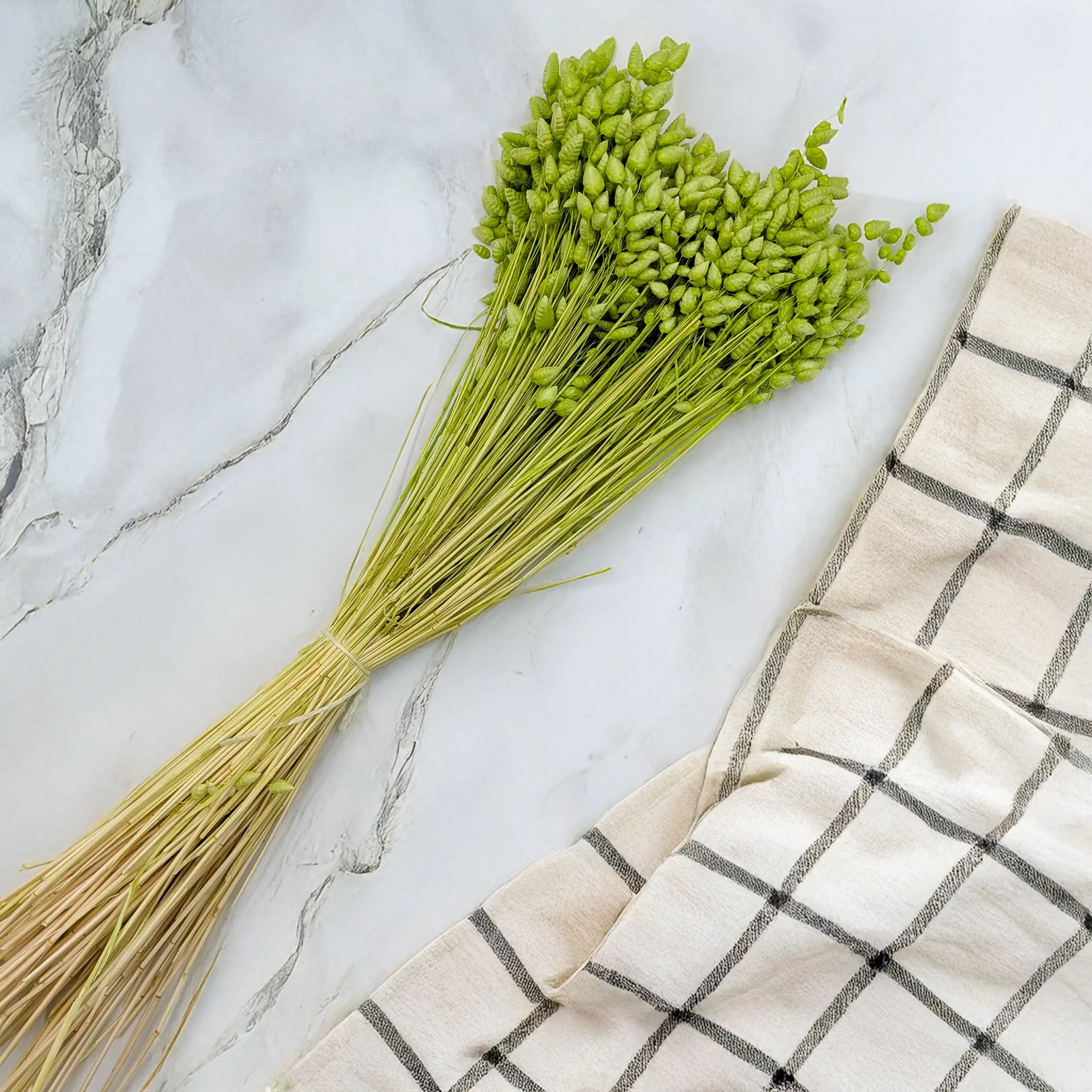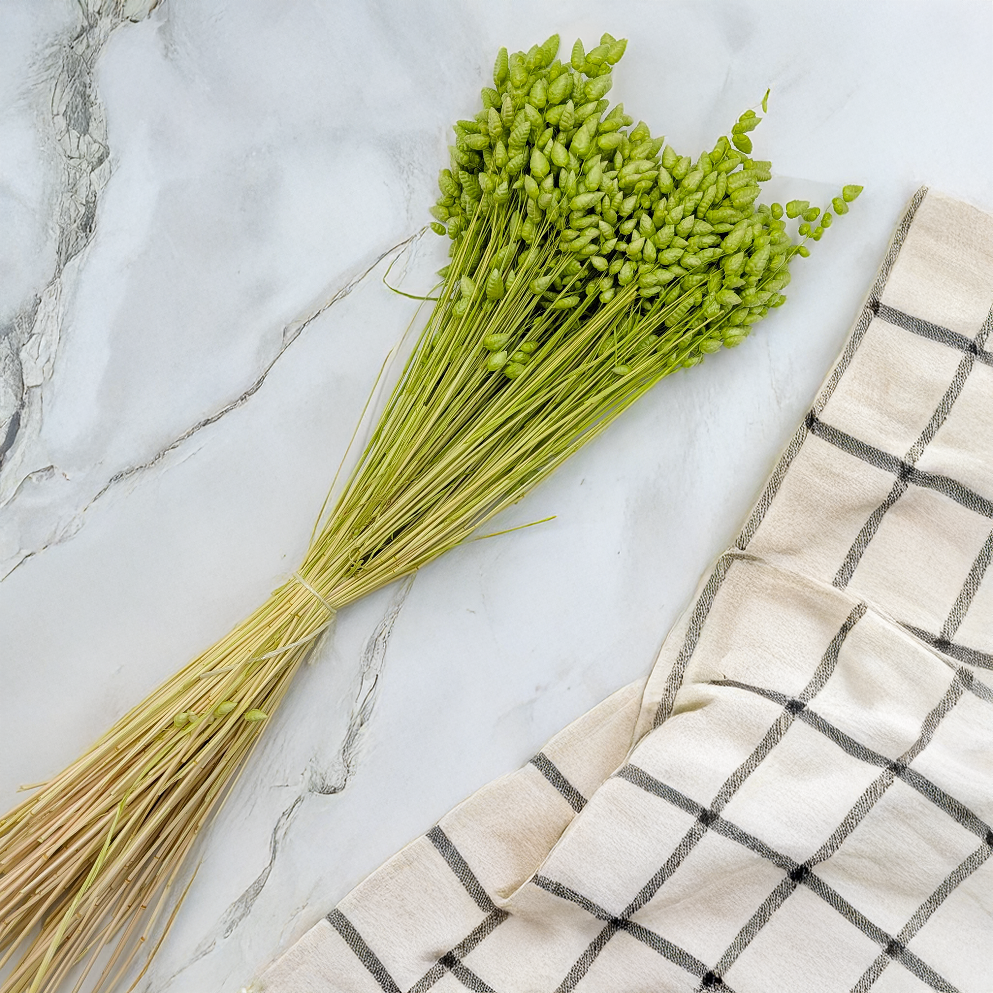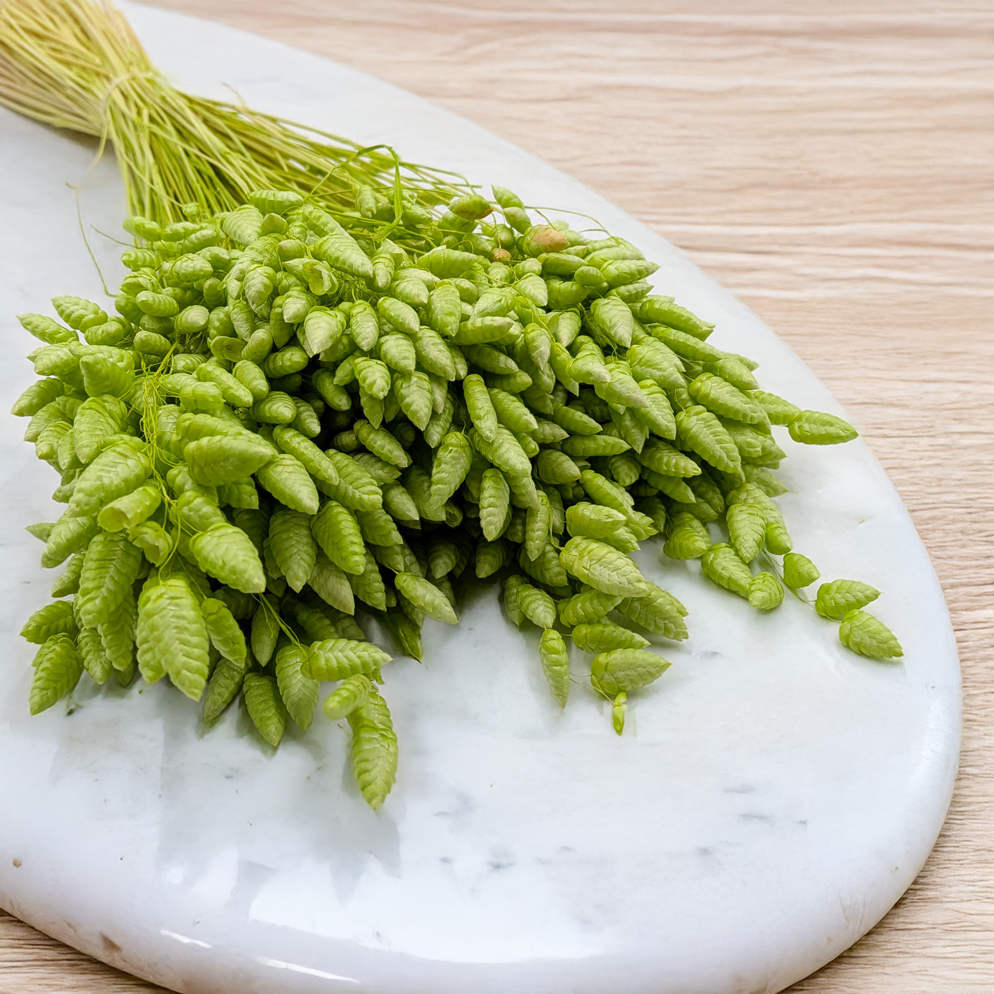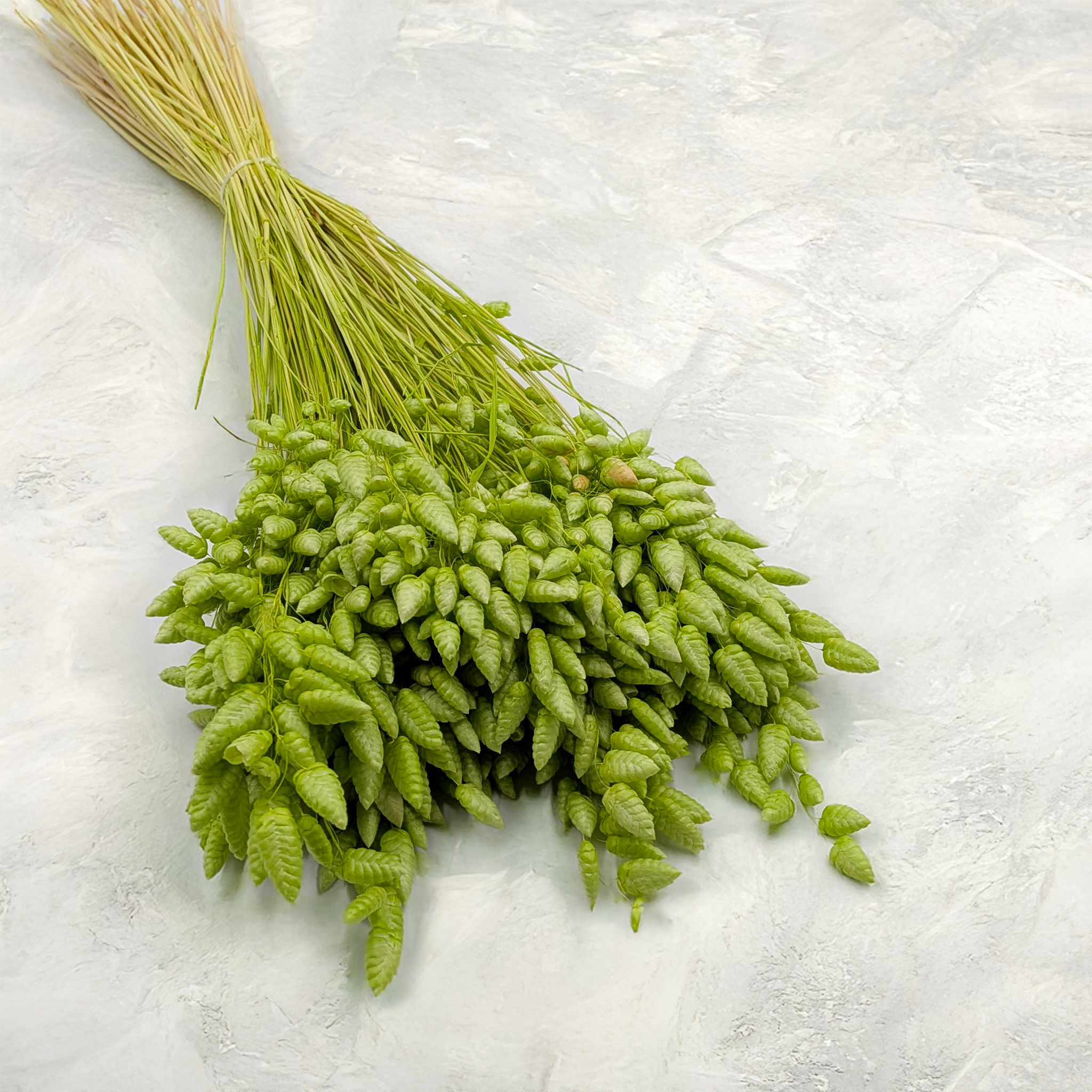Dried quaking grass (Briza Maxima) in a soft light green shade is a subtle and refreshing decorative grass that brings natural balance and lightness to floral arrangements. Its gently trembling seed heads create an organic rhythm and delicate movement, making compositions feel calm, airy and inspired by nature.