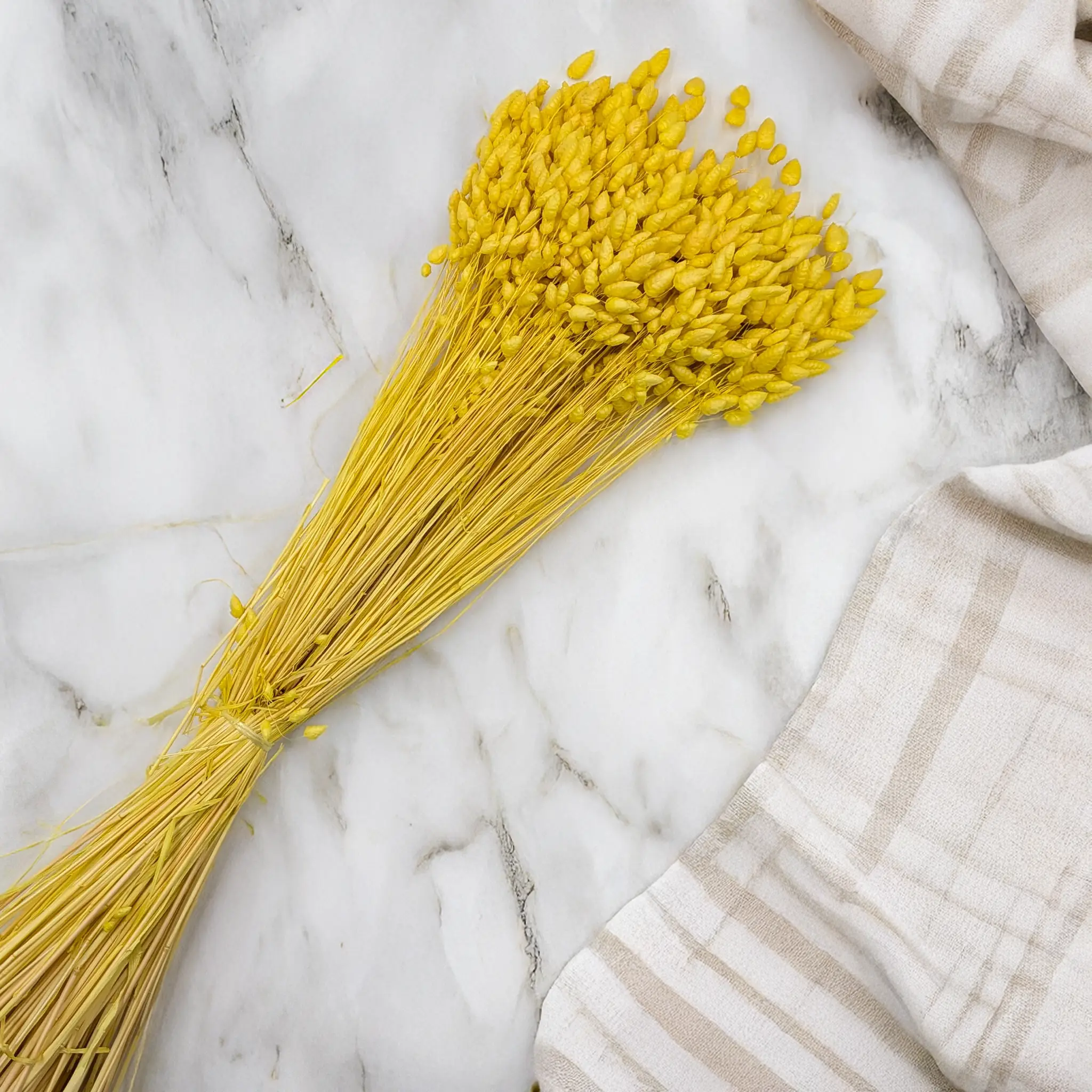 Dried quaking grass (Briza Maxima) in a warm yellow shade is a bright and joyful decorative grass that brings light and positive energy to floral arrangements. Its gently moving seed heads add lightness and subtle motion, enhancing sunny, natural compositions.