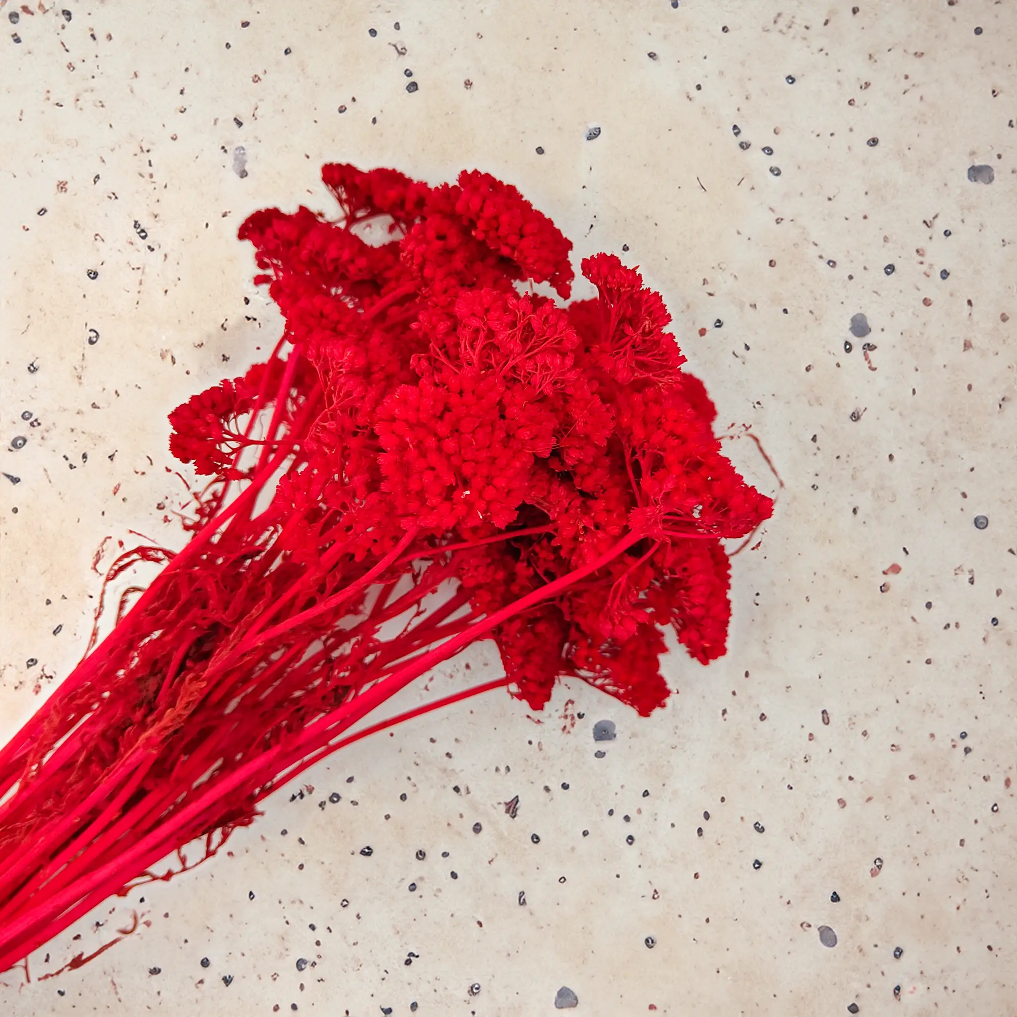 Discover the elegance and power of dried red yarrow (Achillea). Its dense flower clusters bring structure and vibrant character to any floral arrangement.