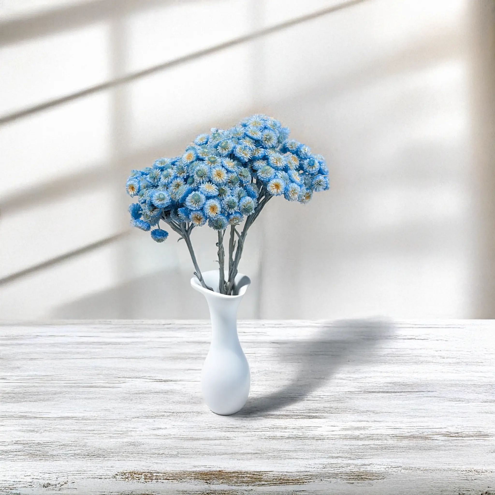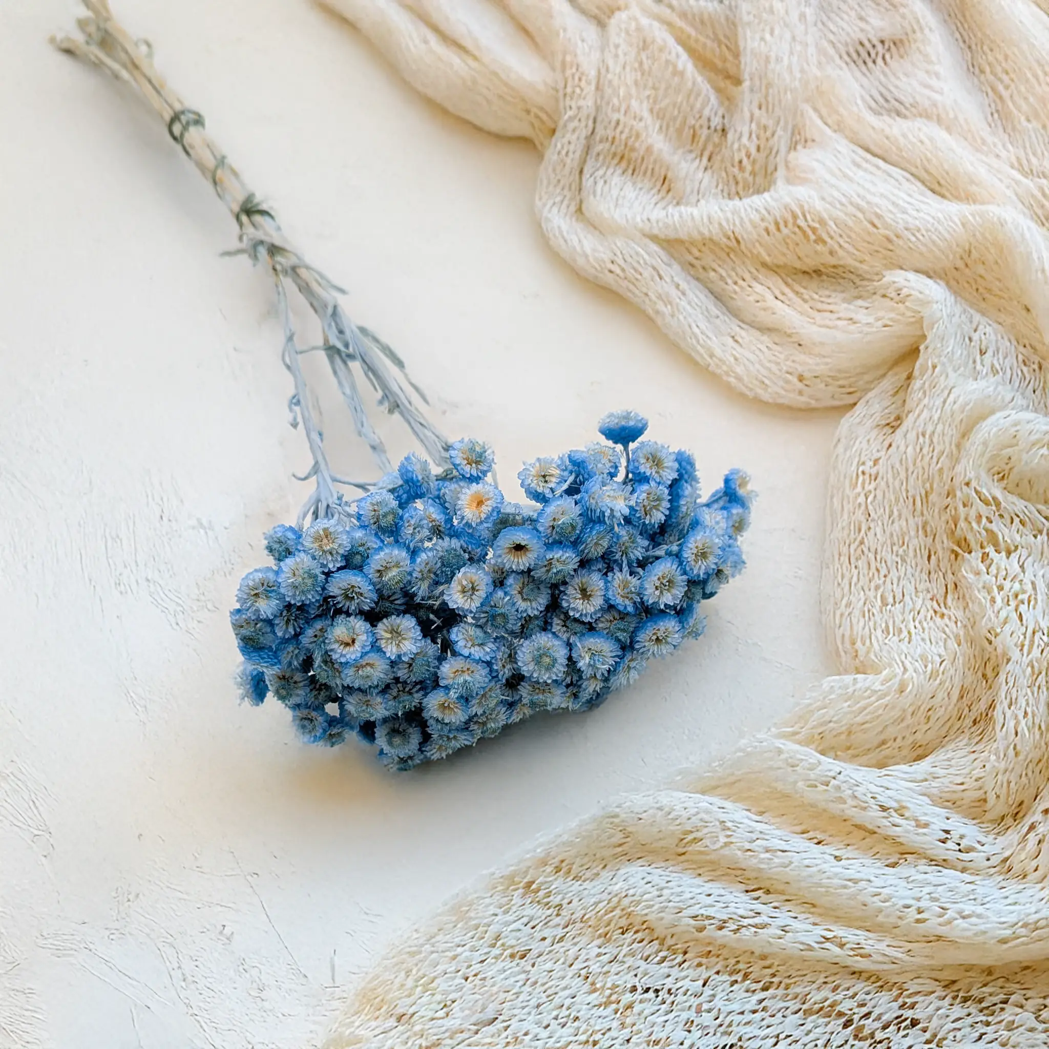 Blue Italian dried immortelle is a decorative plant full of elegance and uniqueness. With its vivid blue flowers and soft silvery foliage, it adds a sophisticated and calming touch to any floral creation.