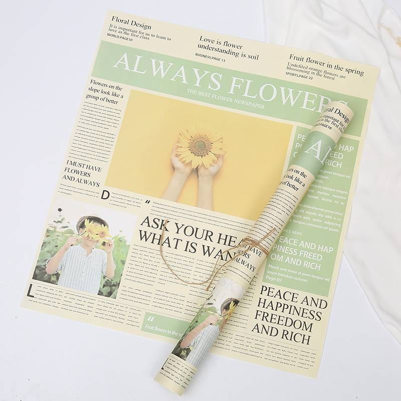 One side of the paper is printed to mimic the authentic look of a newspaper. Thoughtfully designed patterns, text columns, and images make this paper an excellent backdrop for floral arrangements. The other side of the paper features a smooth surface.