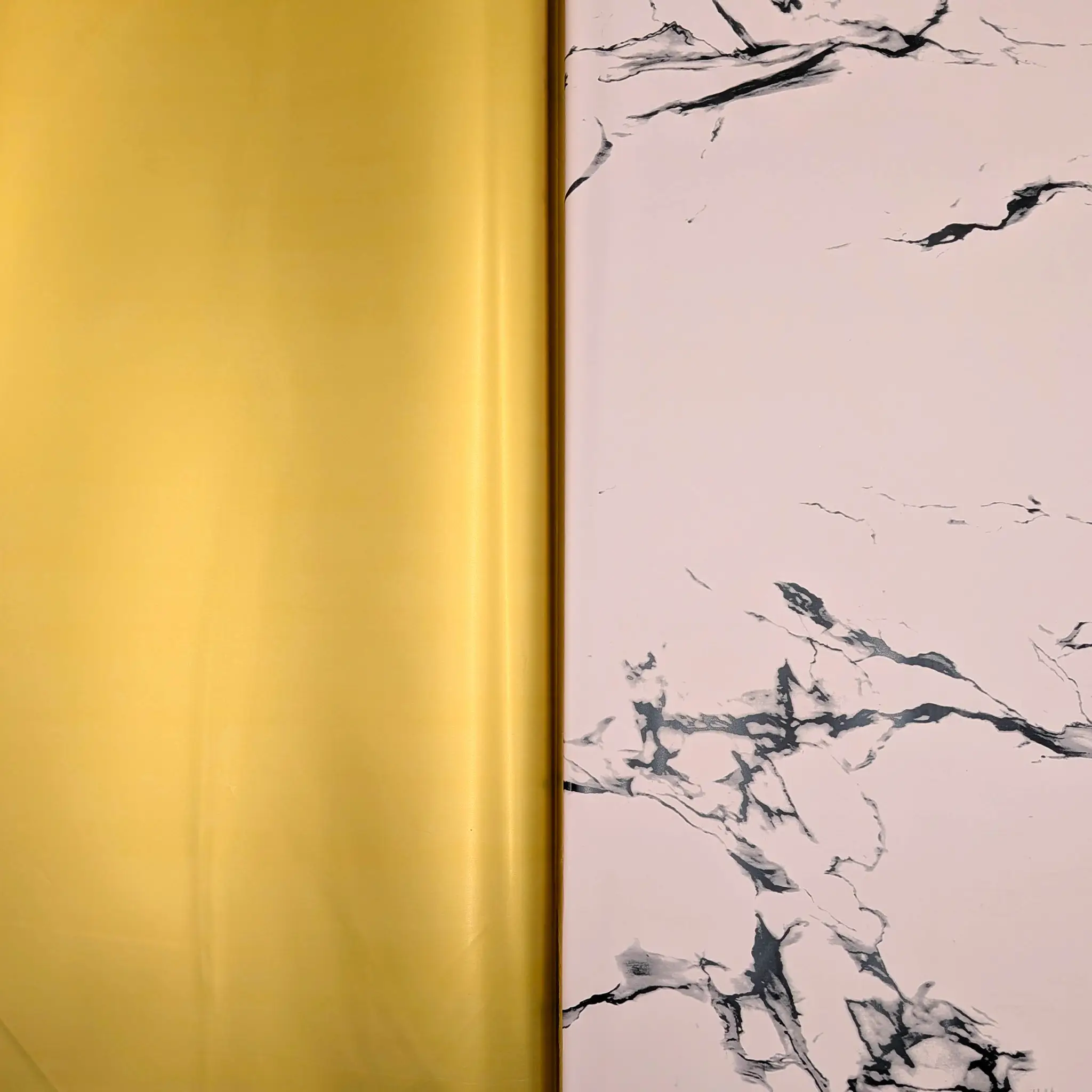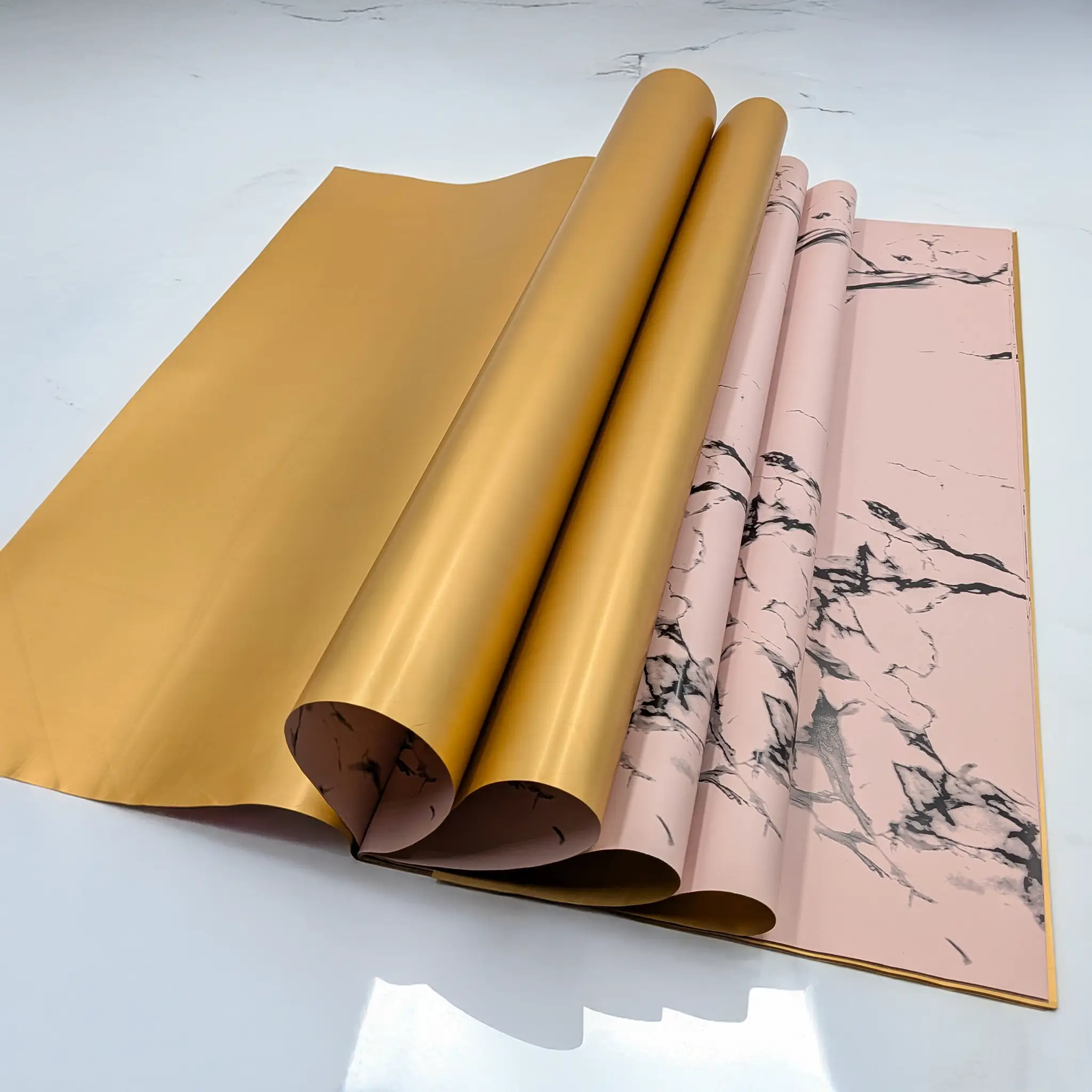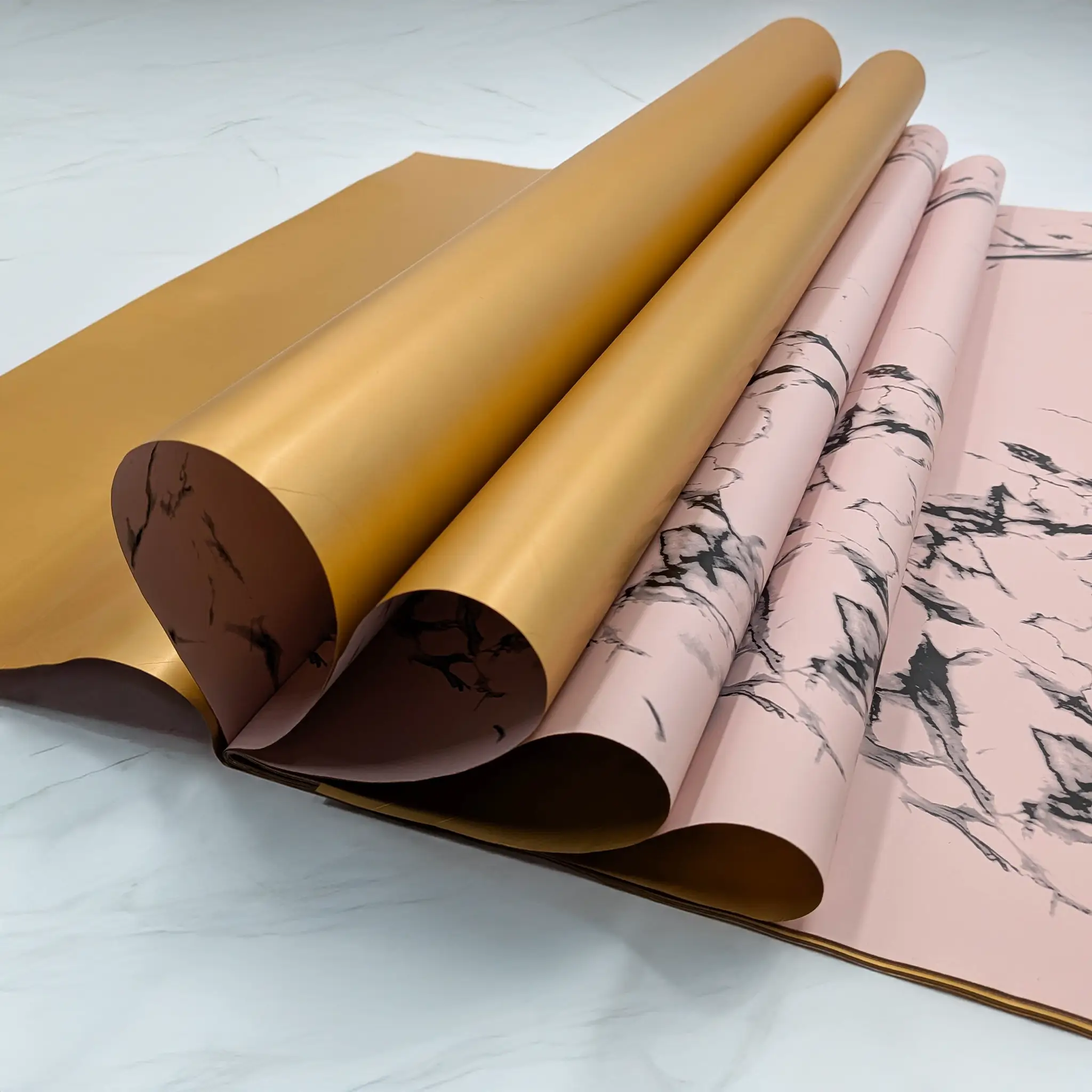 Stone&Shine in icy pink is a double-sided florist film designed for modern arrangements and refined aesthetics. One side of the sheet features a subtle marble pattern in a cool, icy pink tone with a delicate hint of grey, while the reverse side is smooth and gold, creating a balanced and professional contrast.