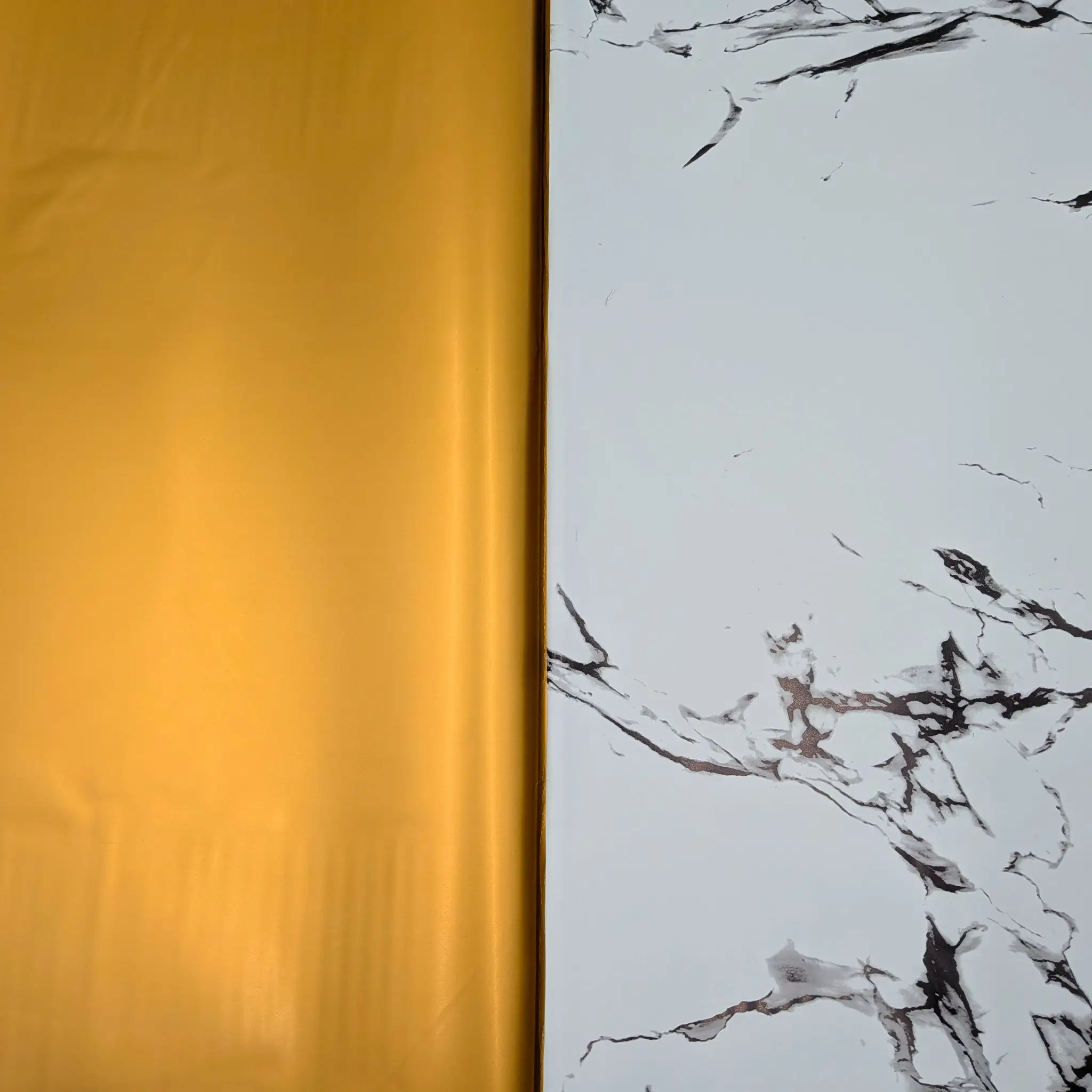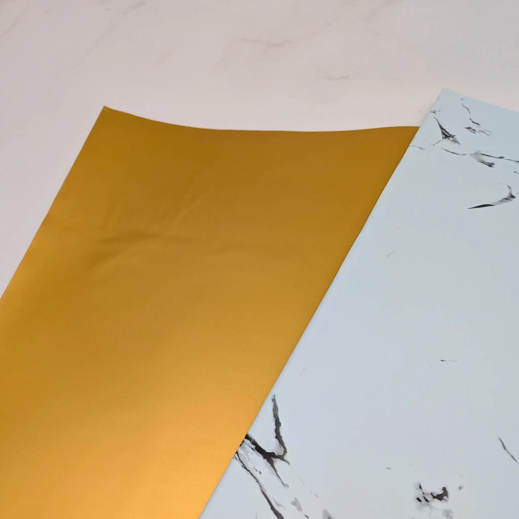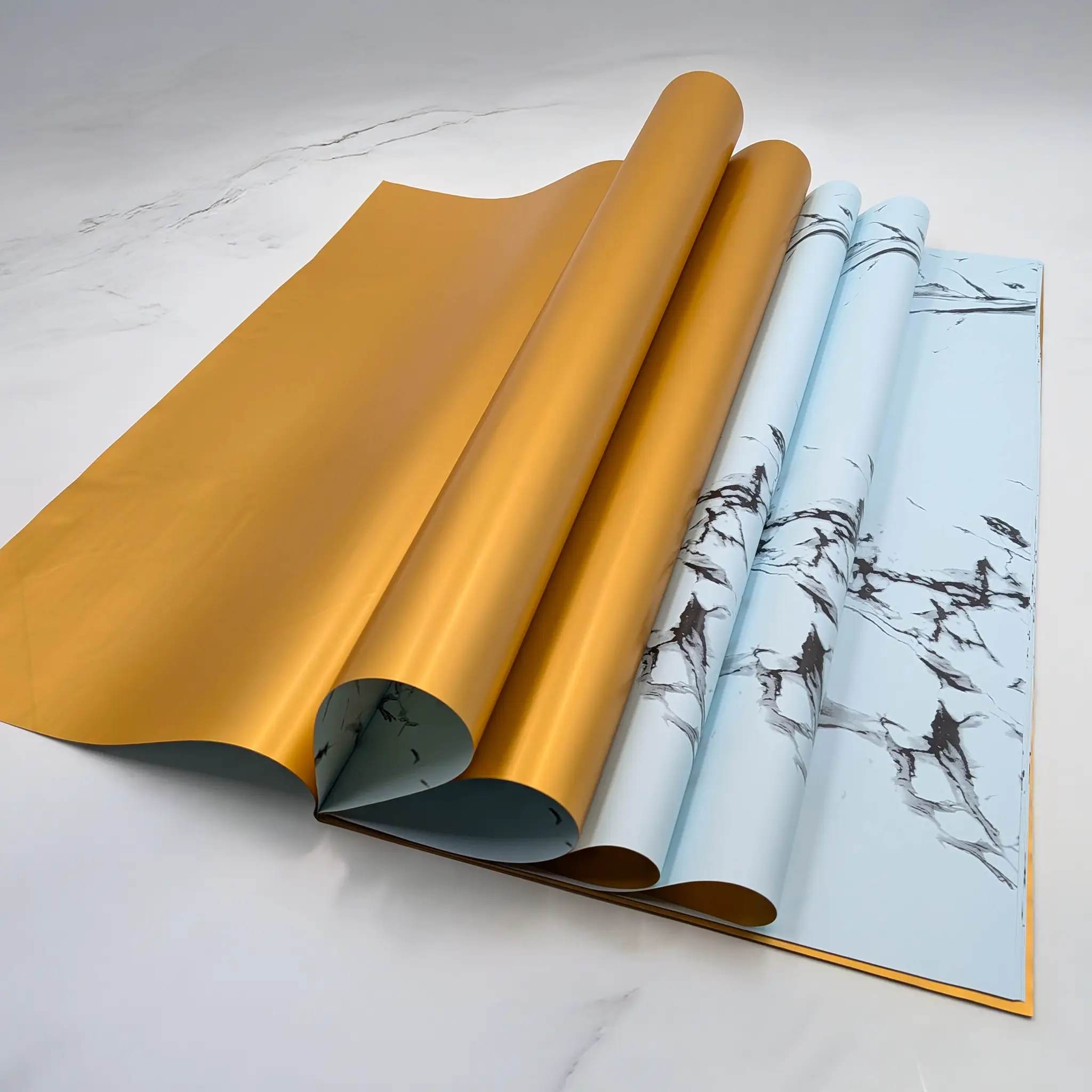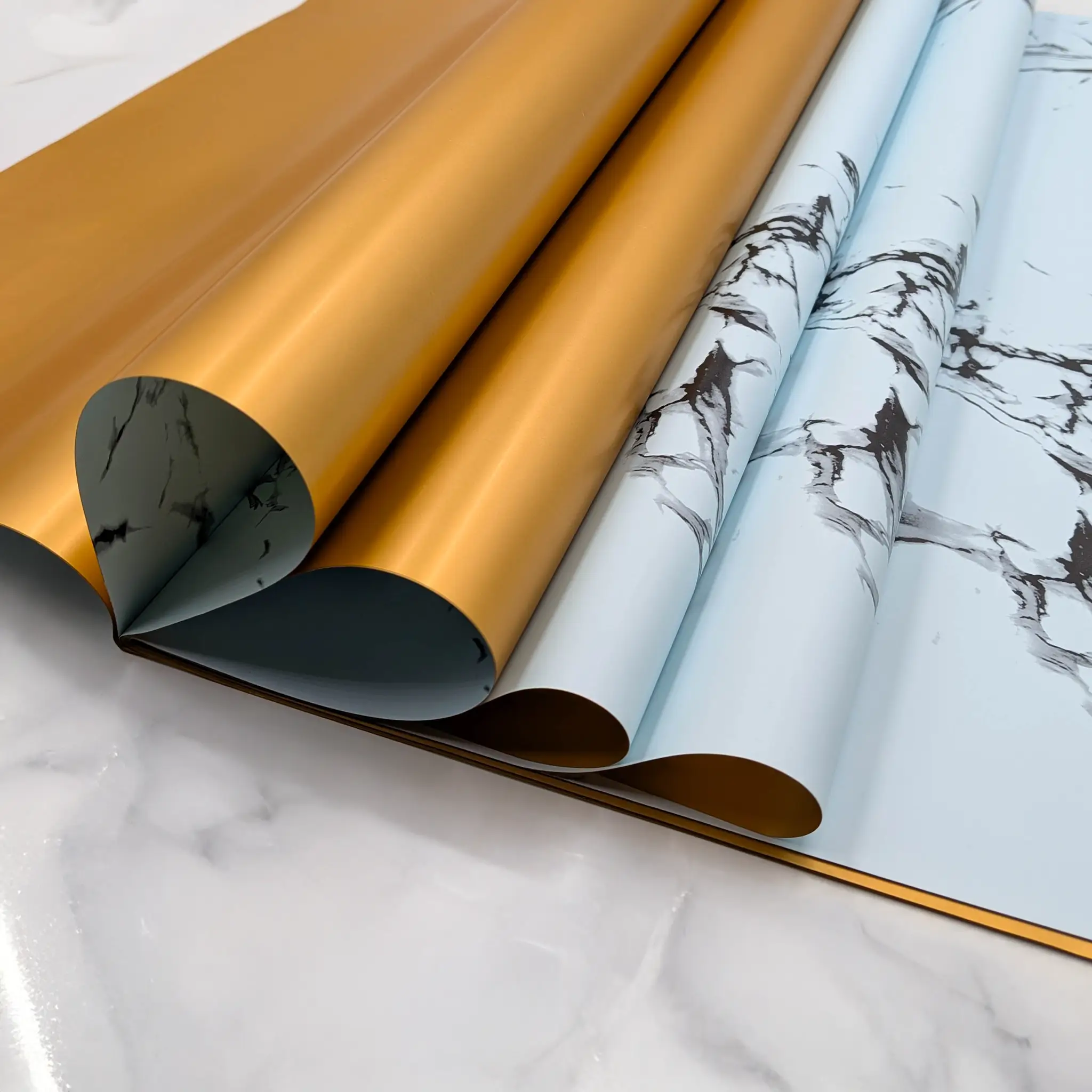 Stone&Shine in light blue is a double-sided floral wrapping film inspired by the calmness of the sky and modern elegance. One side features a soft marble-style pattern in a pale blue tone, while the reverse side is smooth and gold, creating a balanced and sophisticated contrast.