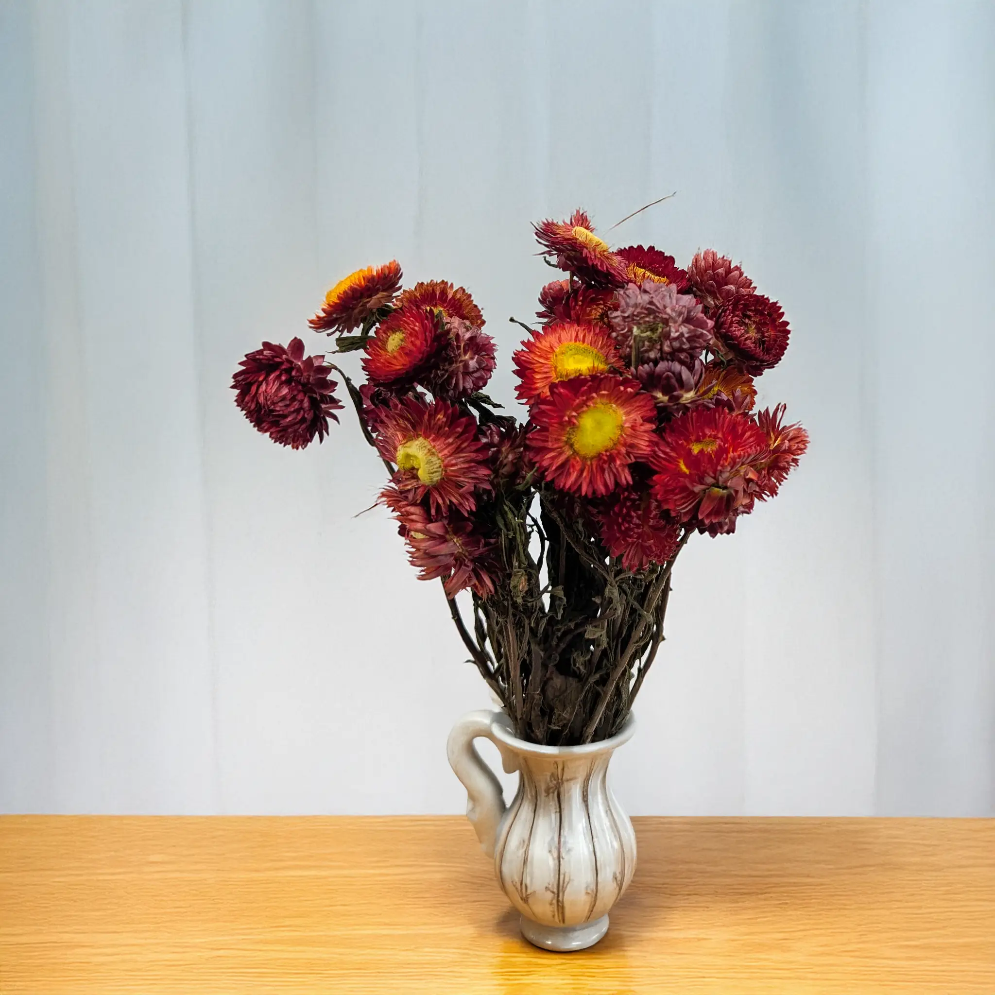 Scarlet red dried Helichrysum brings warmth, passion, and vibrancy to any interior. Its deep, rich red hue symbolizes love, strength, and courage, making it a stunning highlight in floral and decorative projects.