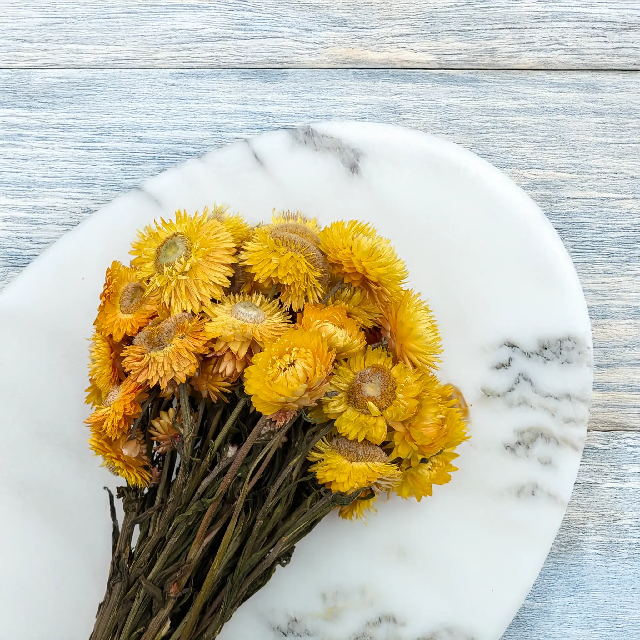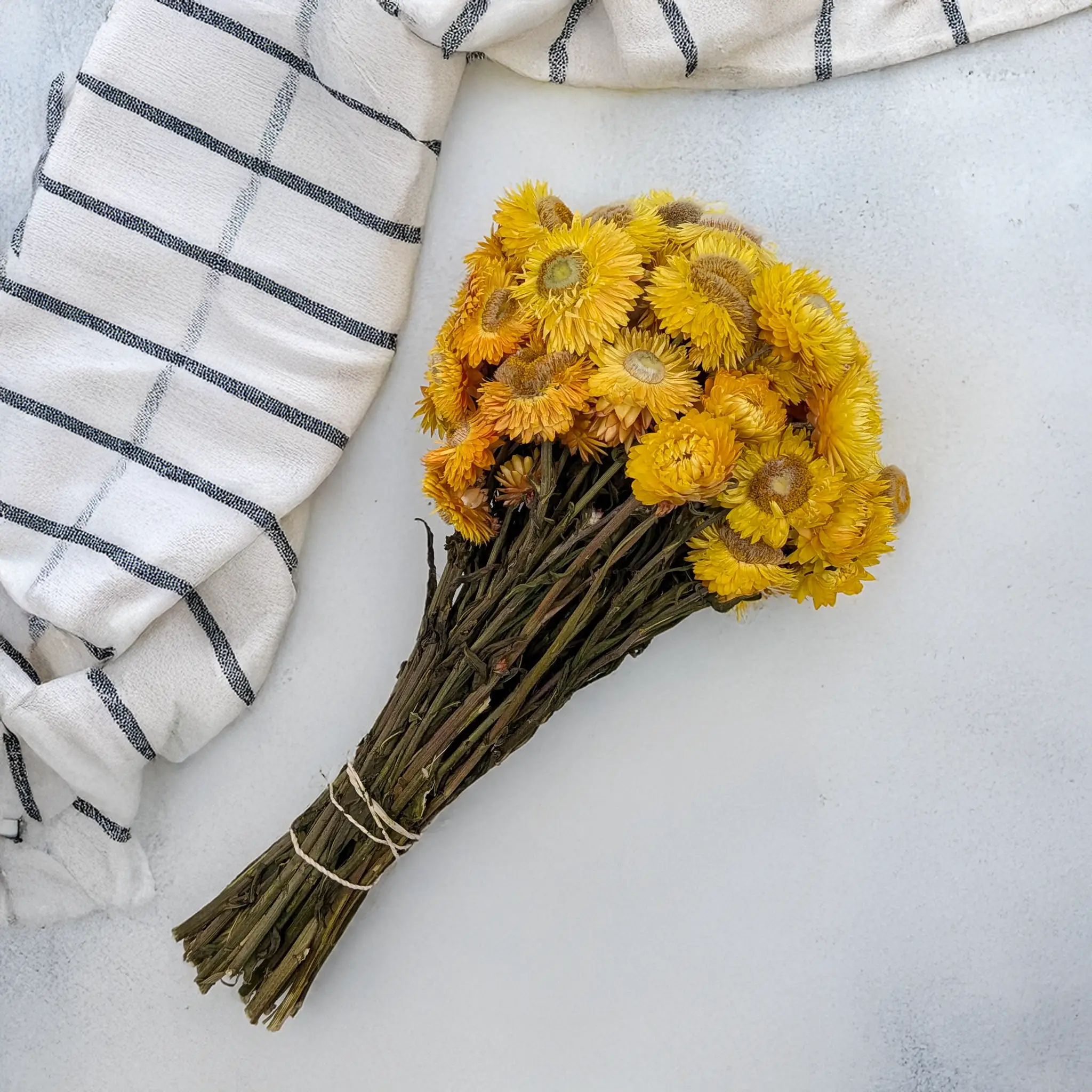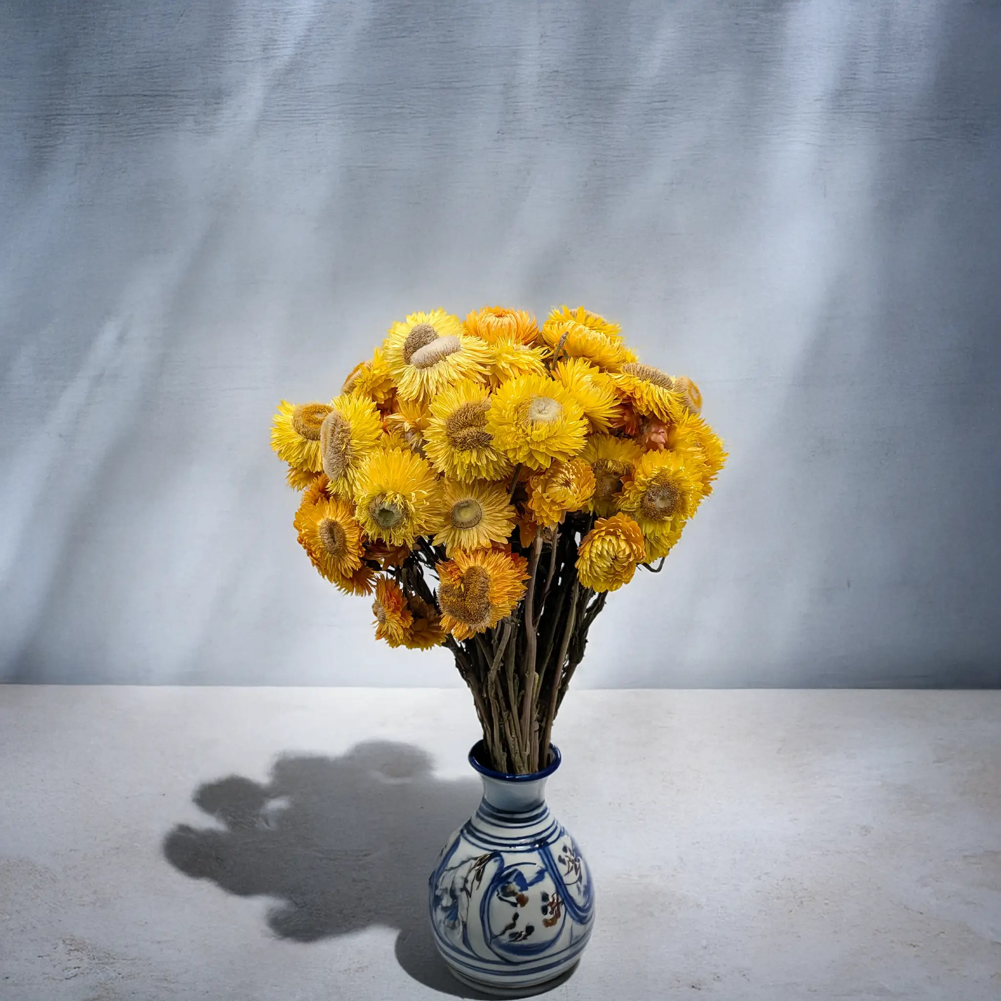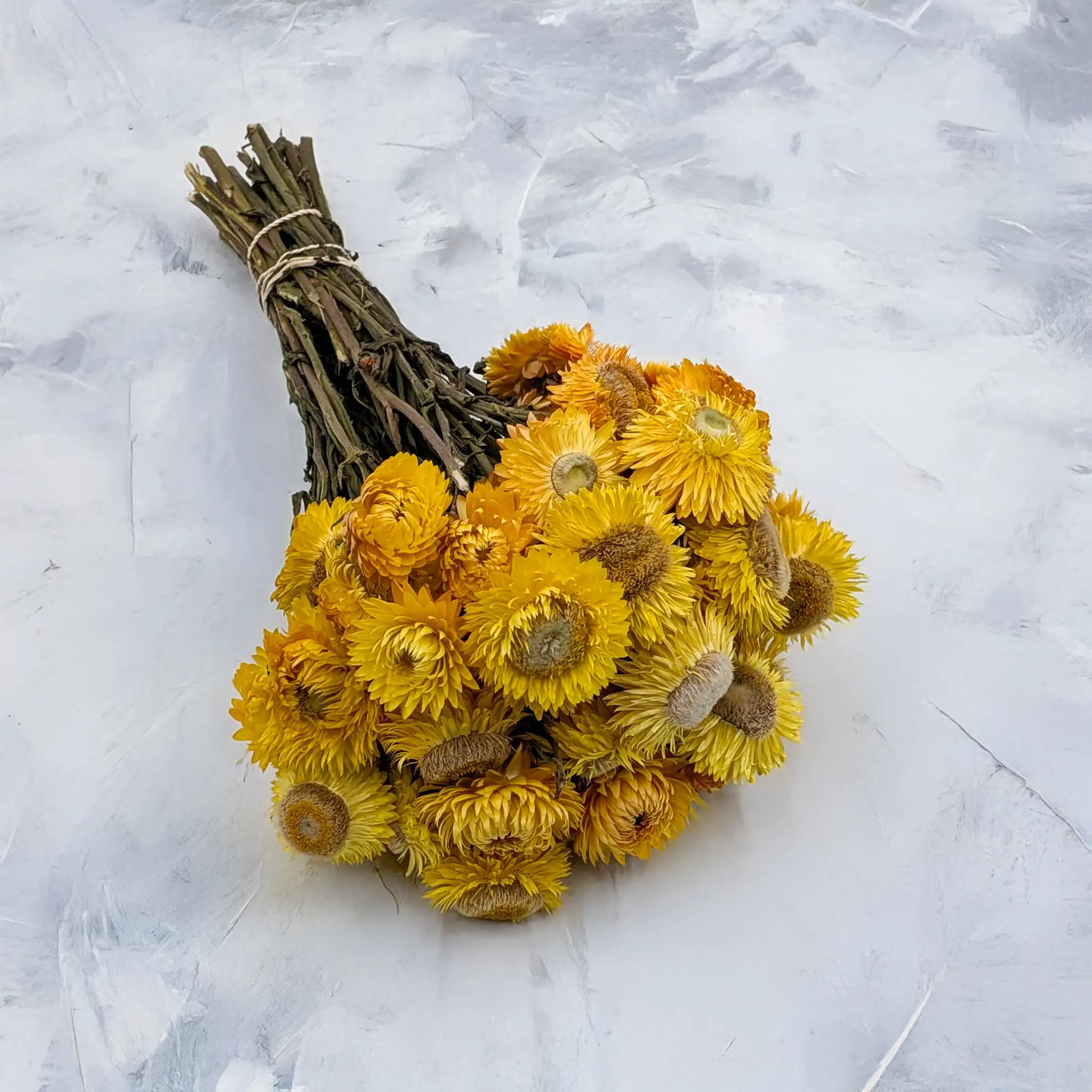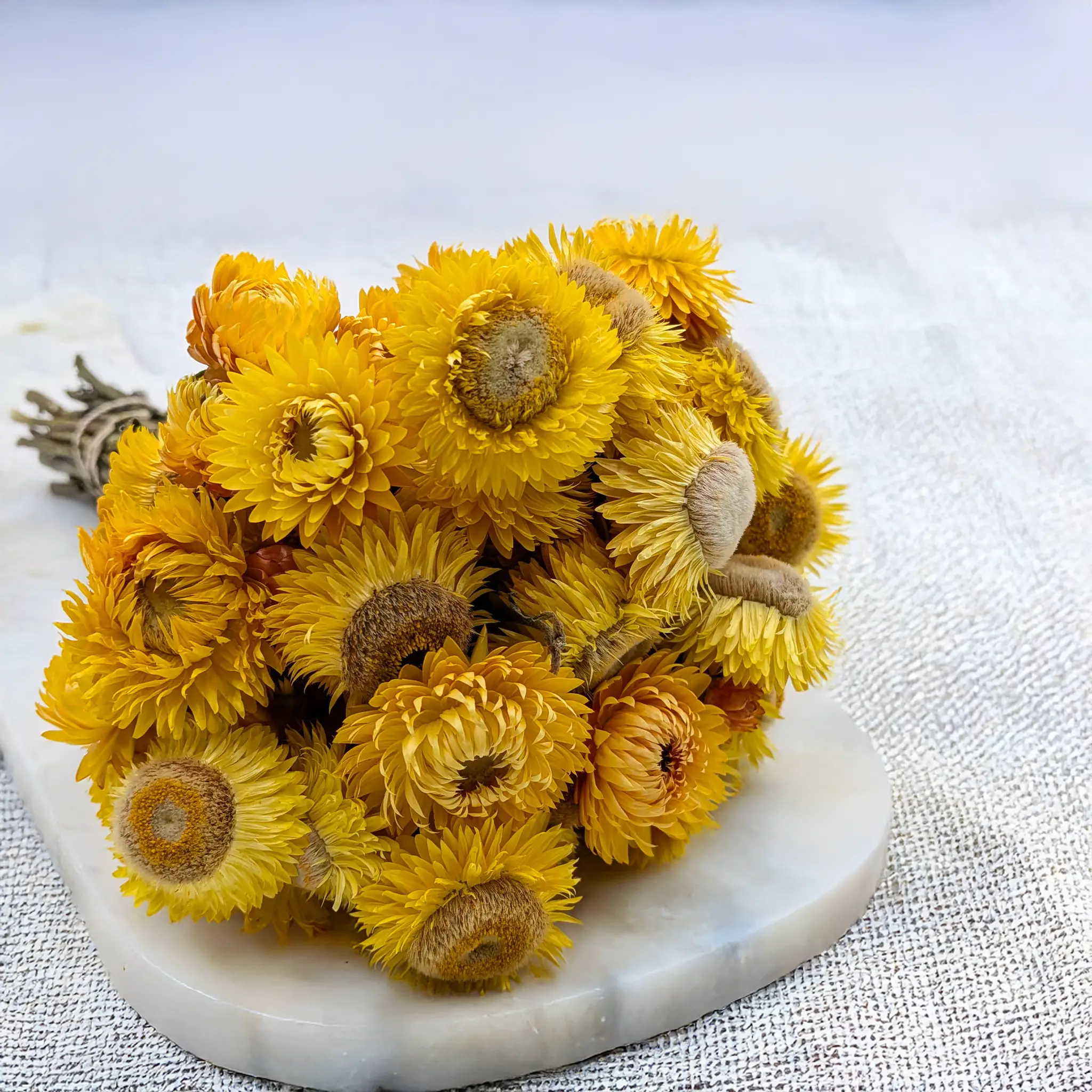 Yellow dried immortelle is a charming and long-lasting decorative flower with a natural, sunny tone. Its delicate and papery blooms make it a perfect addition to rustic bouquets, boho arrangements, and DIY floral projects.