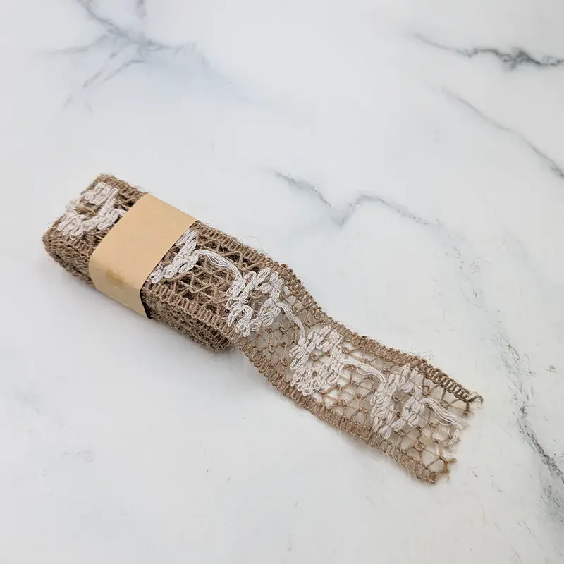 The delicate embroidery contrasts beautifully with the raw jute structure, making this ribbon perfect for rustic wedding arrangements, bouquet wrapping, eco-style gift packaging, and nature-inspired DIY crafts.