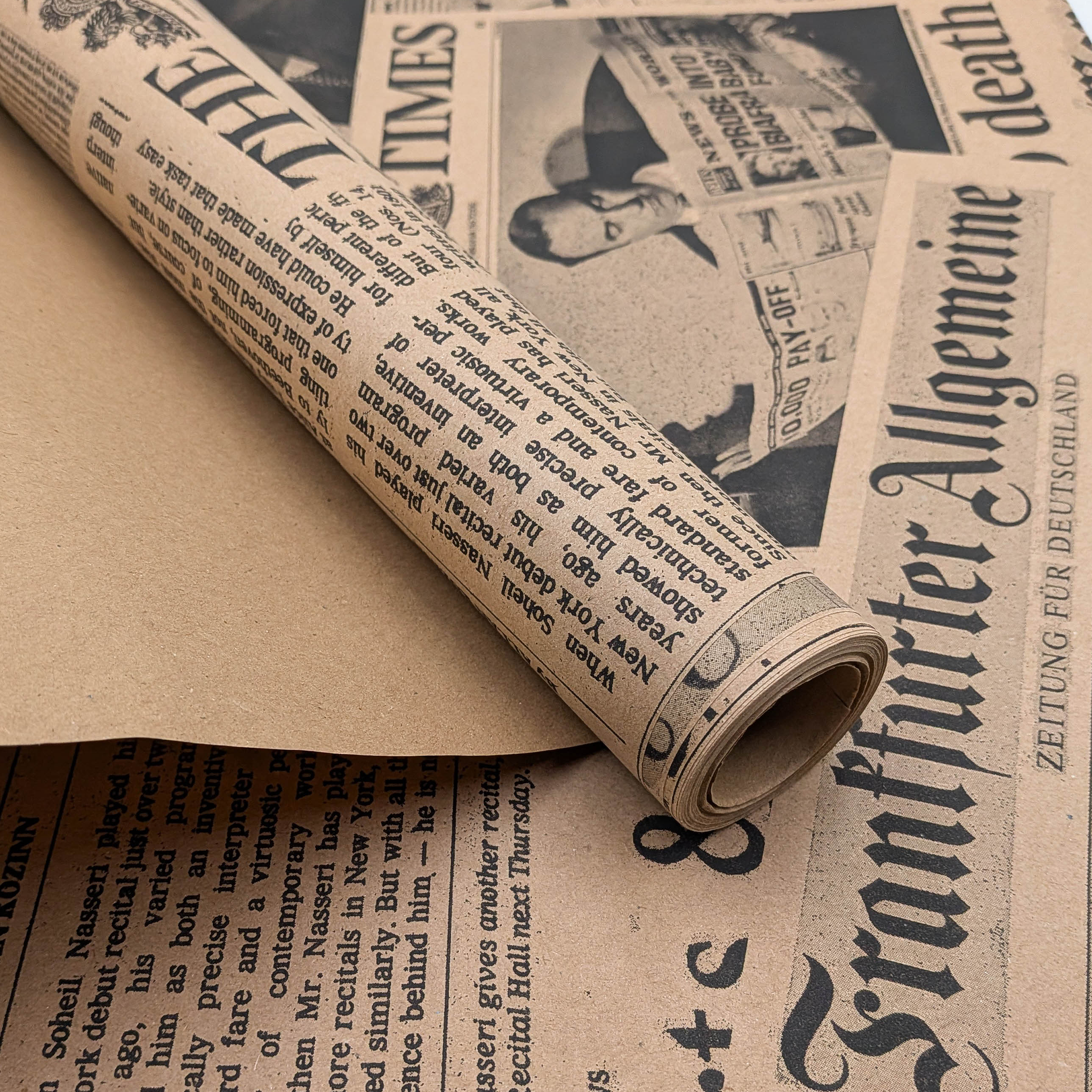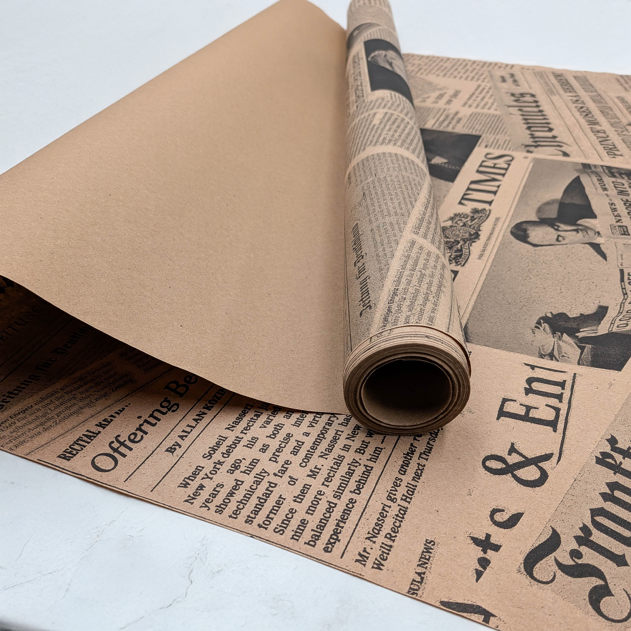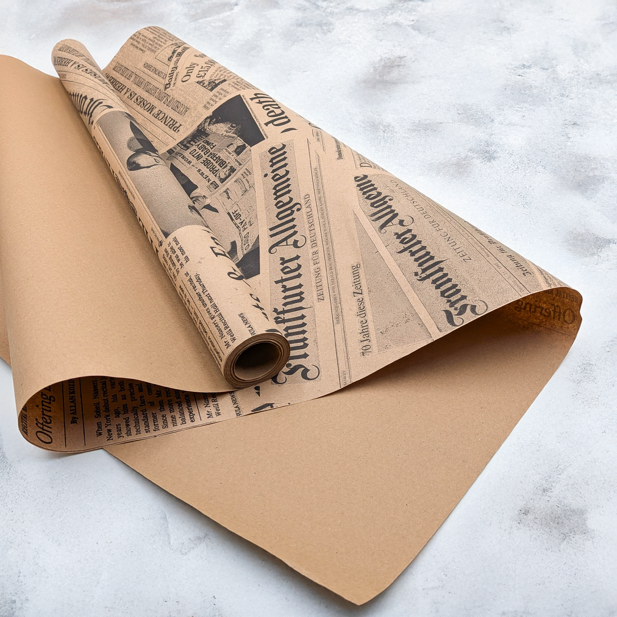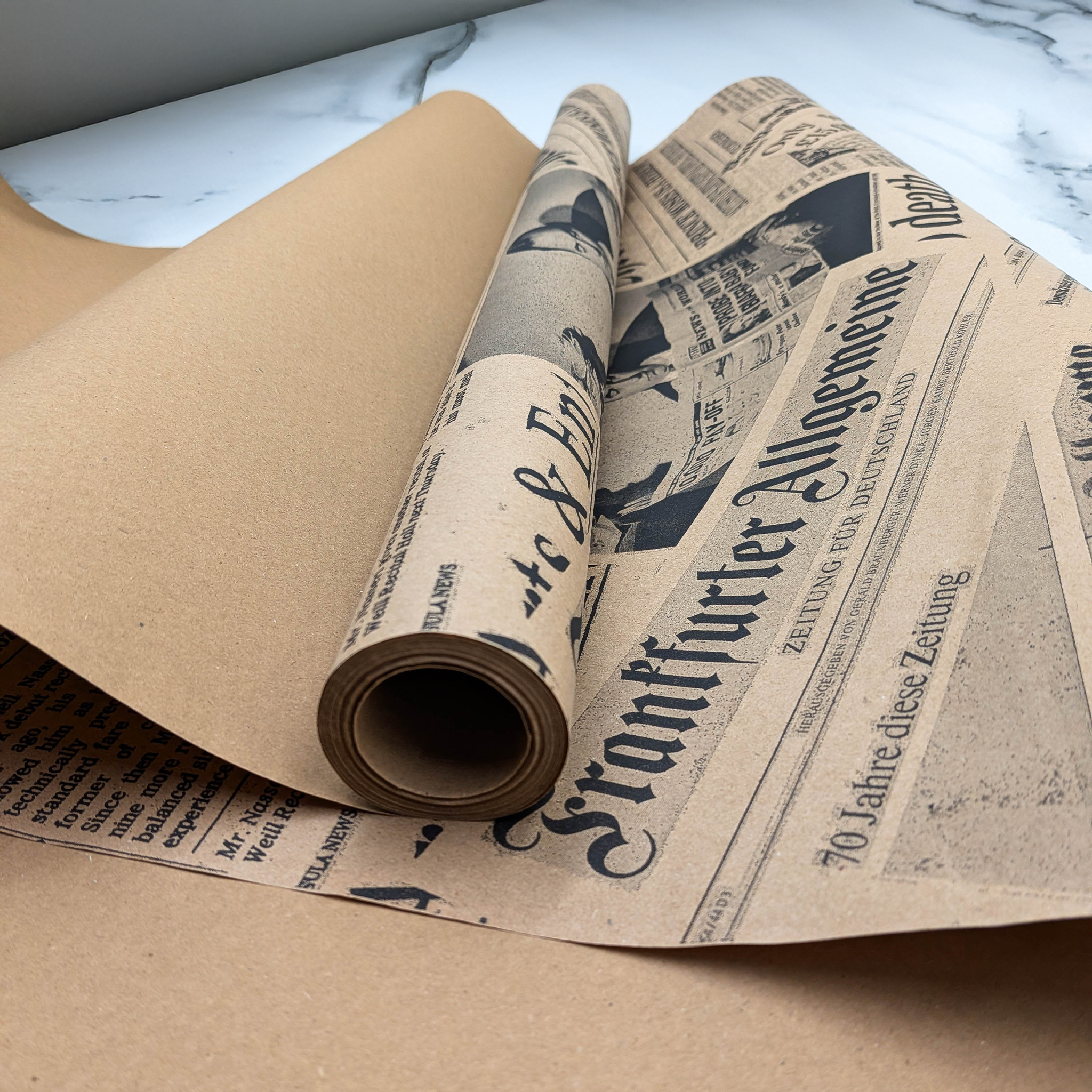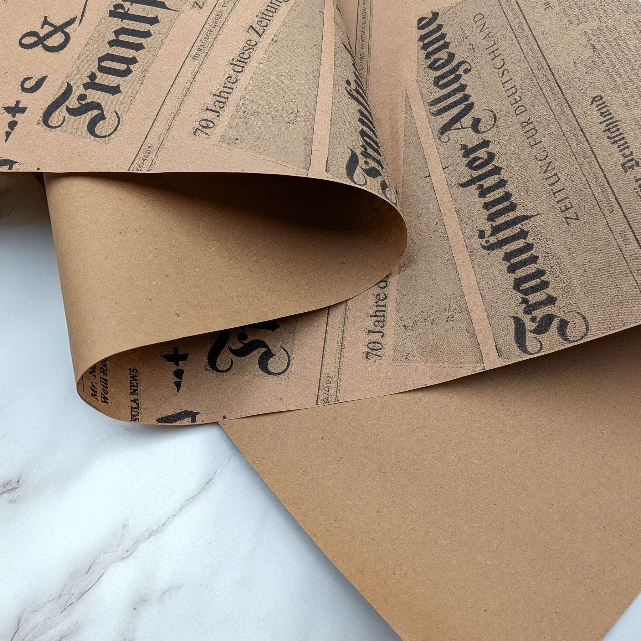 Black newspaper print kraft paper combines the natural texture of kraft paper with a stylish print inspired by traditional press layouts. The bold black typography creates a modern, slightly industrial and fashionable look.