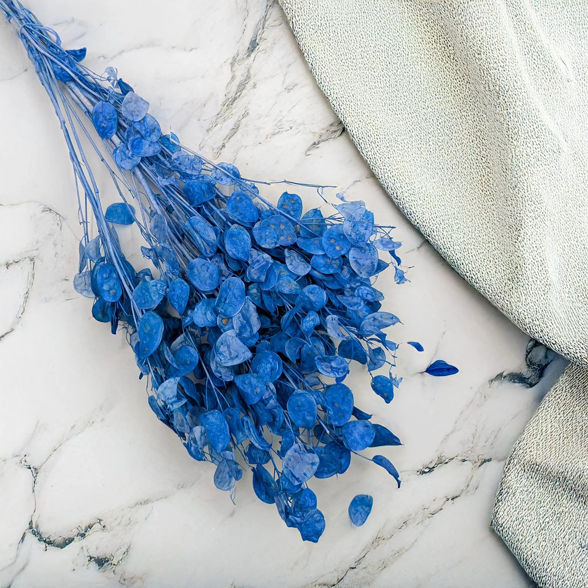 Our dried blue lunaria is a unique floral accent that adds depth, calm and elegance to any arrangement. With its papery, translucent leaves and bold color, it's perfect for modern, boho or minimalist designs.