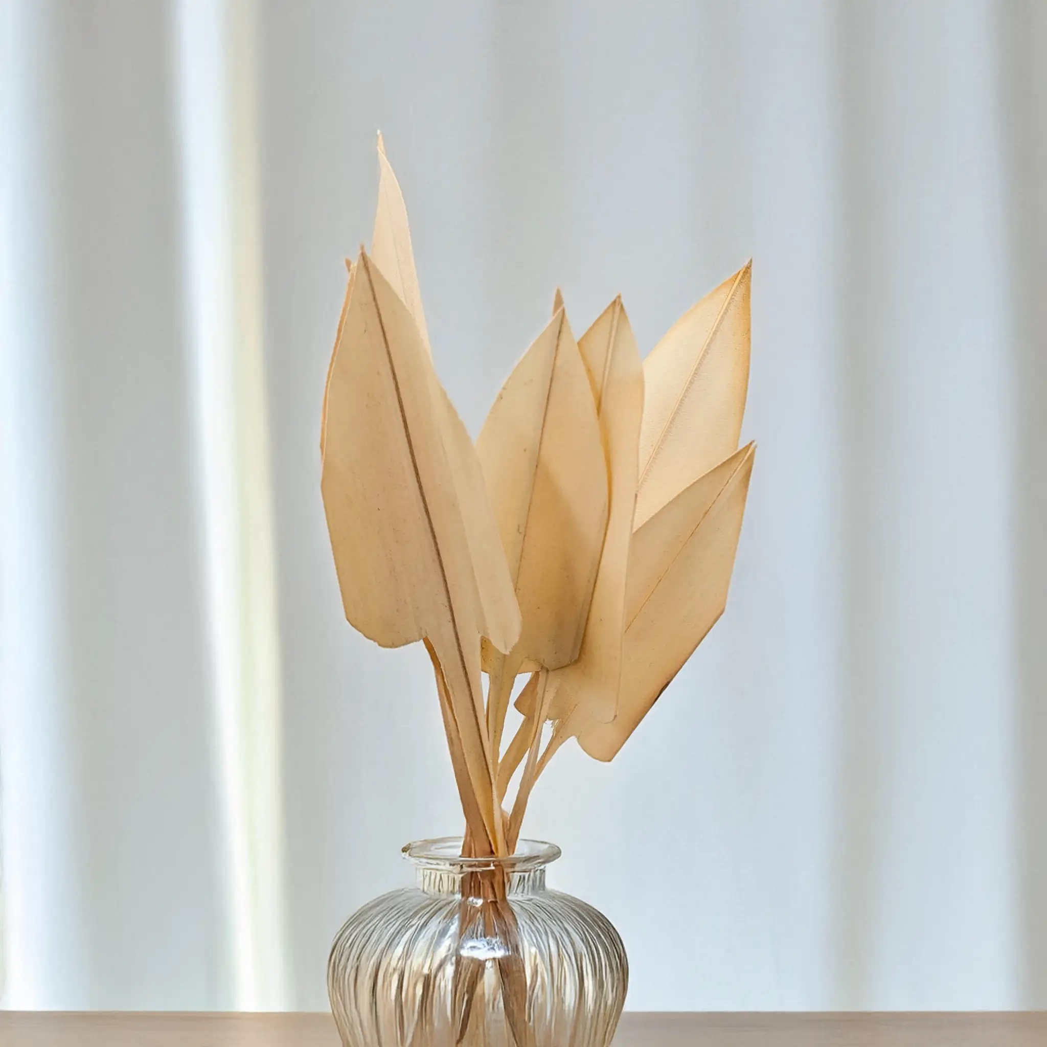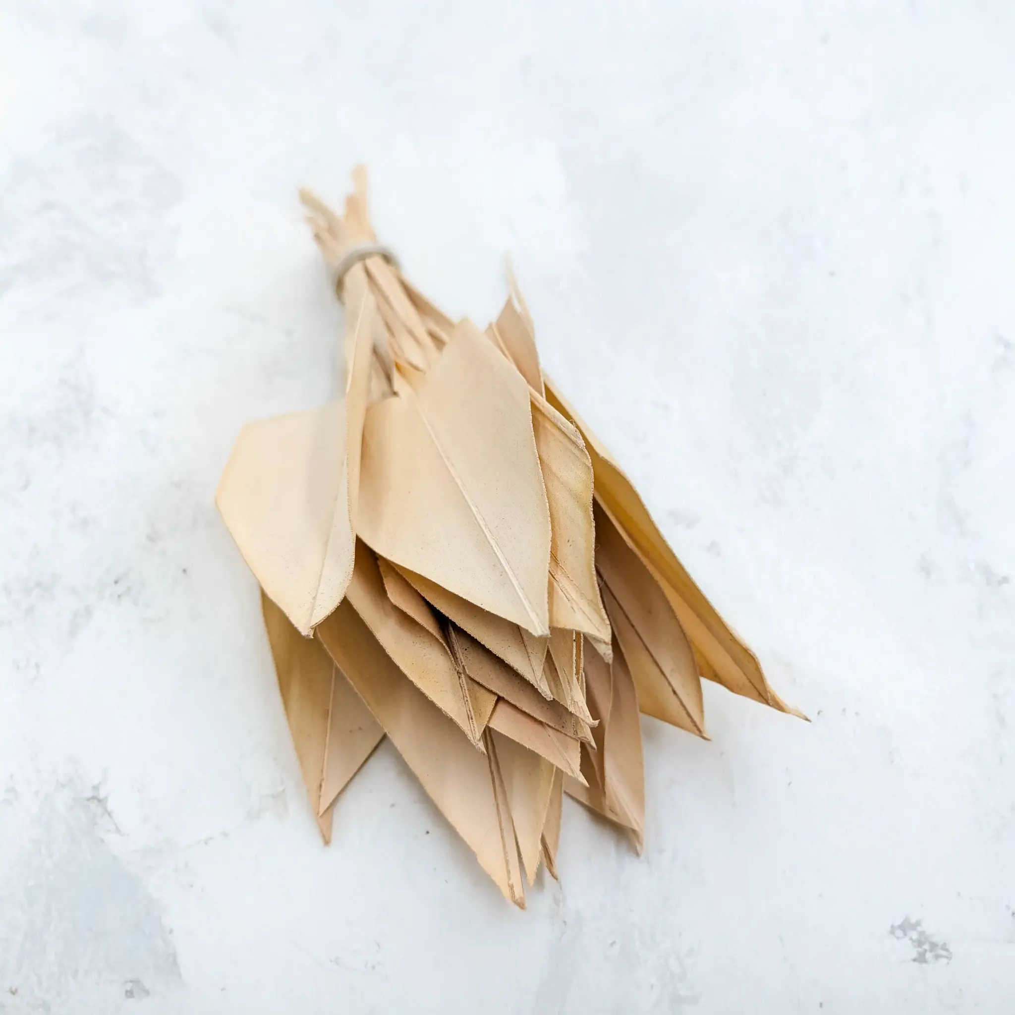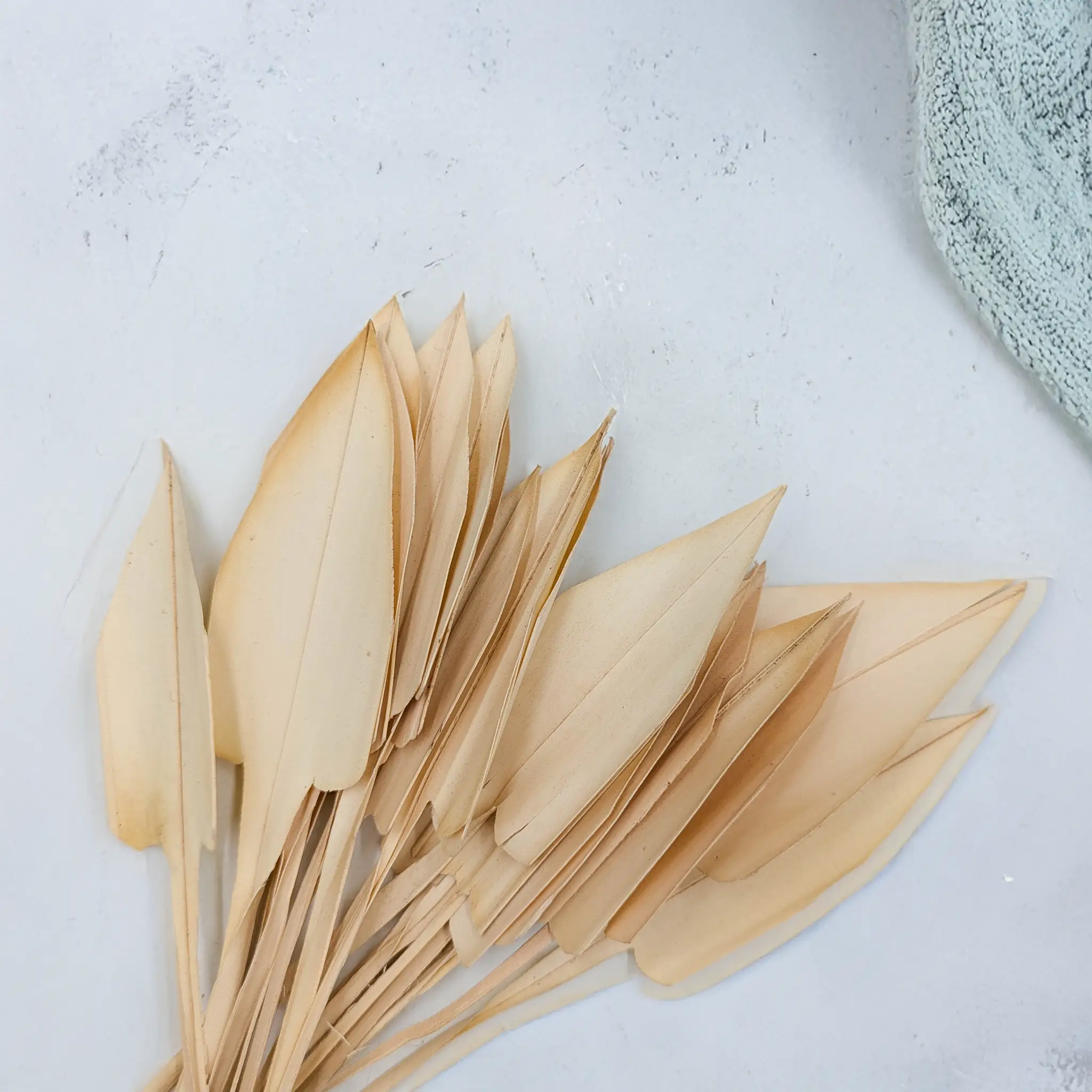 These bleached Palm Arrow Leaves are short, spear-shaped dried palm leaves measuring approx. 15 cm. Their soft ivory tone and small size make them ideal for detailed floral designs like boutonnieres, corsages, gift wrapping and wedding decor. Perfect for Japandi and boho styles.