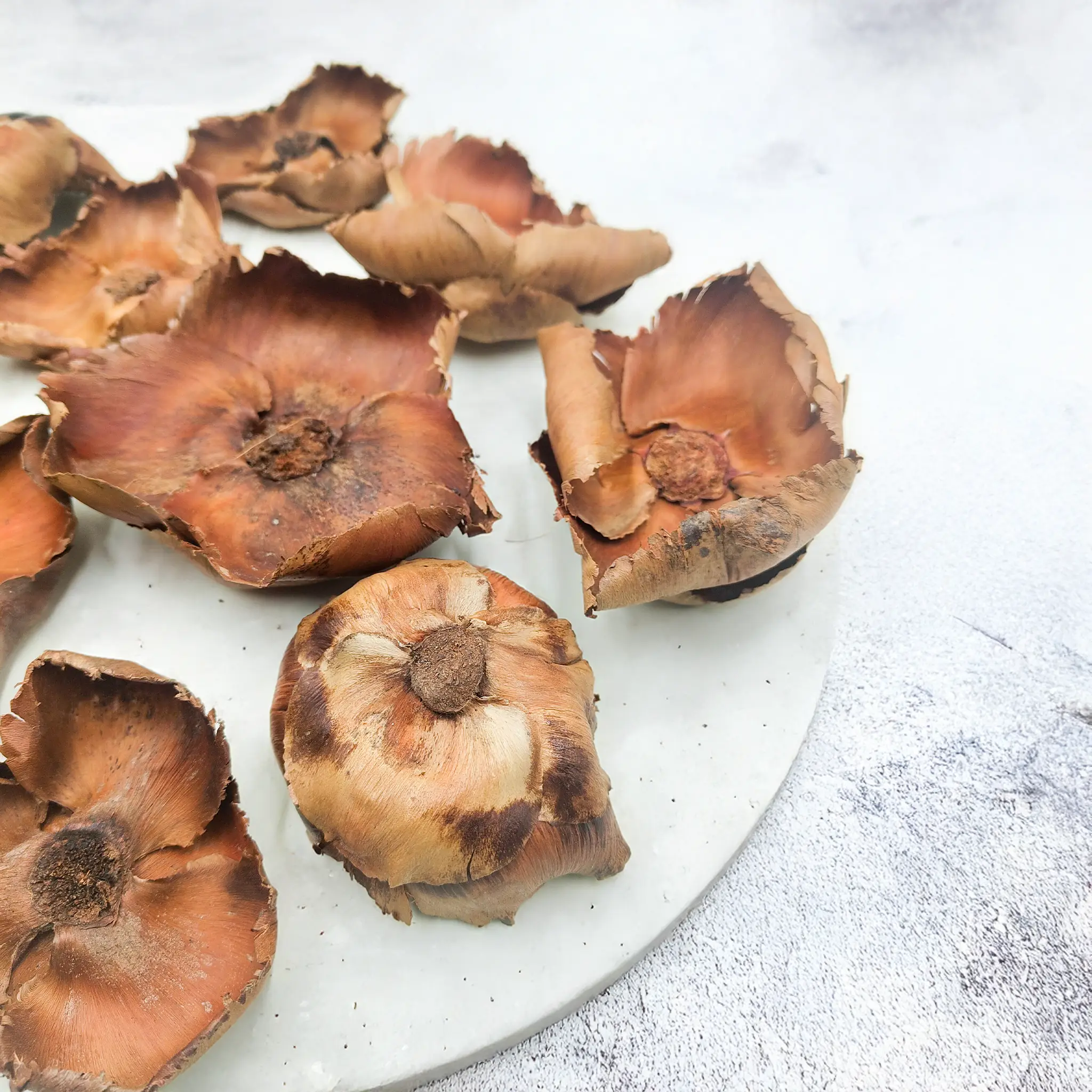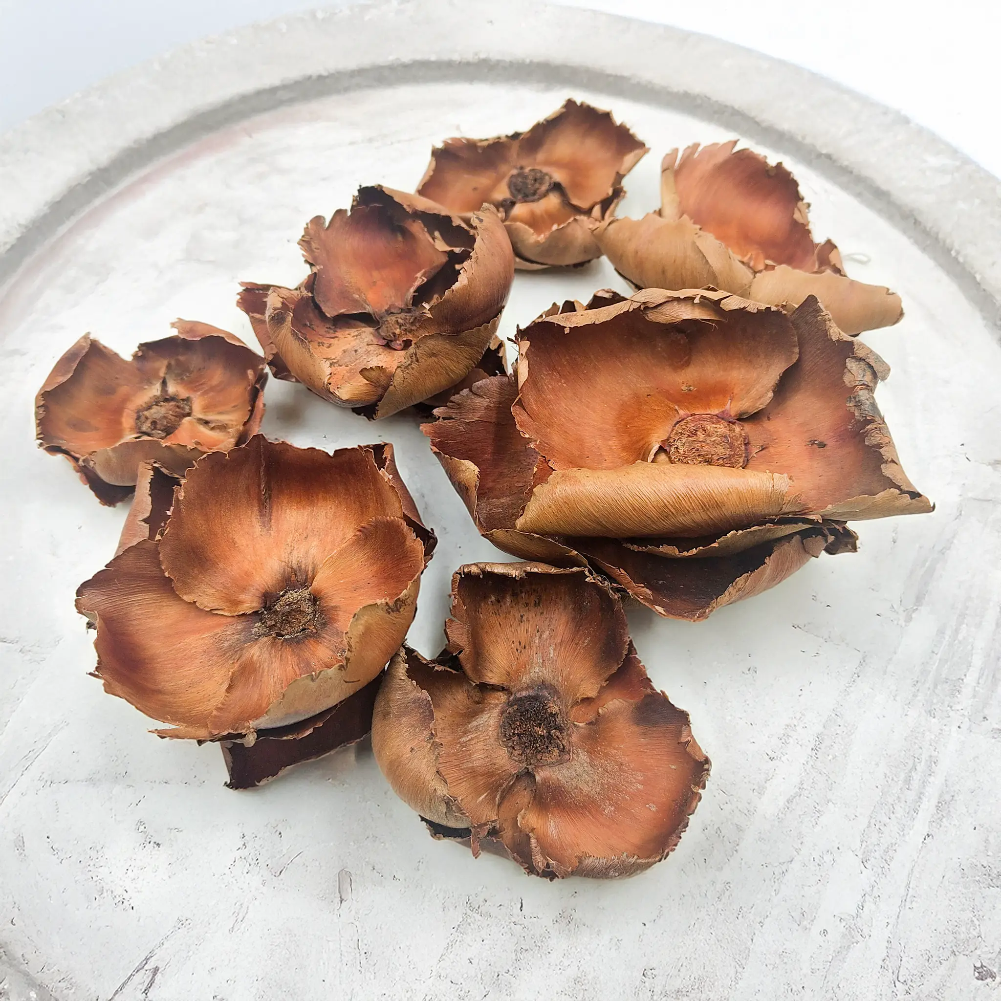Palm Cup is a natural, dried palm fruit featuring a distinctive cup-like shape. Its open form and warm beige-brown tones bring an organic, rustic accent to floral arrangements and natural décor.