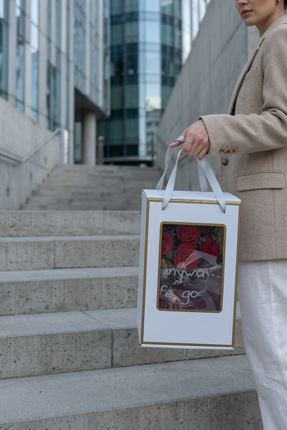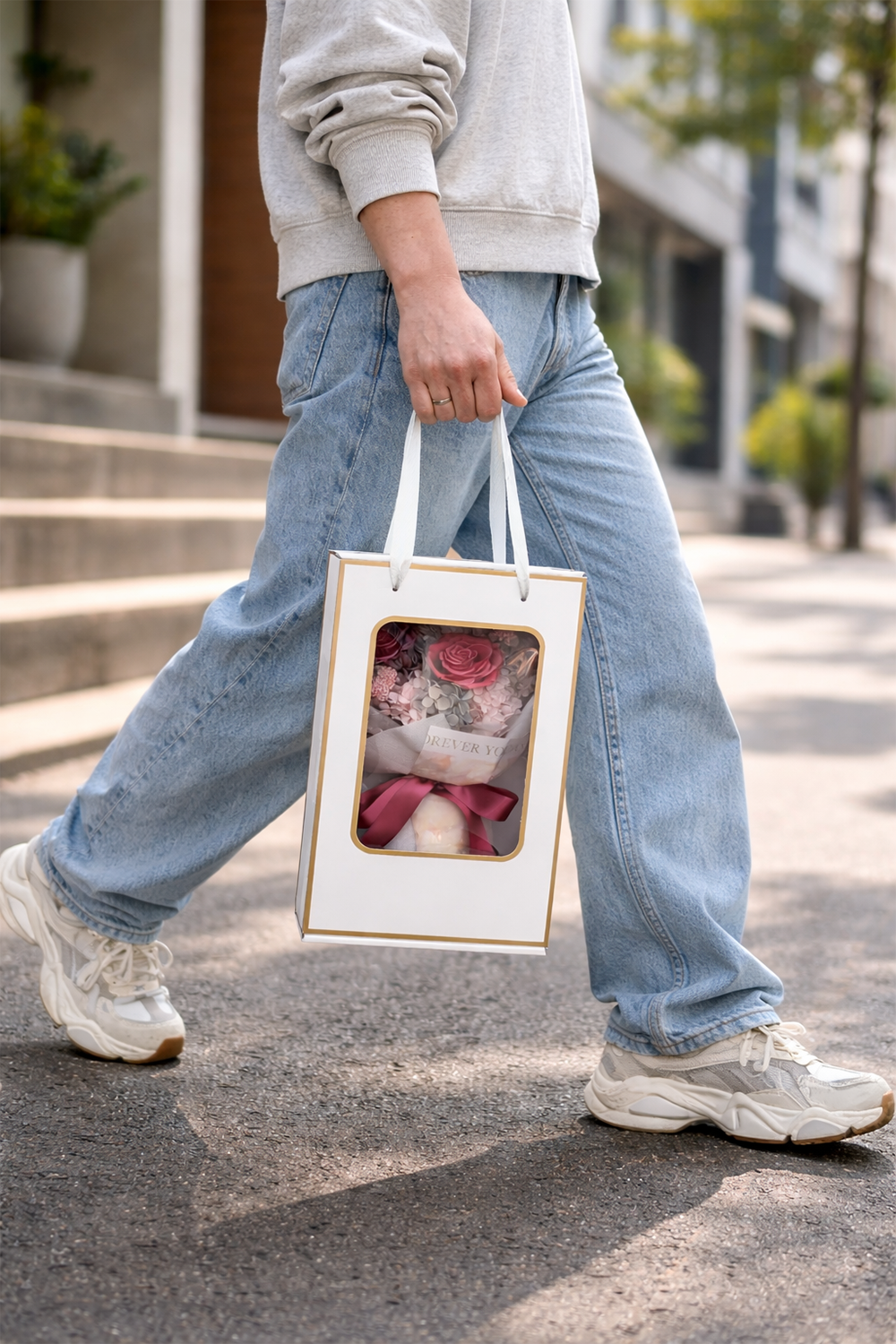 The bouquet is wrapped in floral foil and ribbon, placed in a premium box with handle.