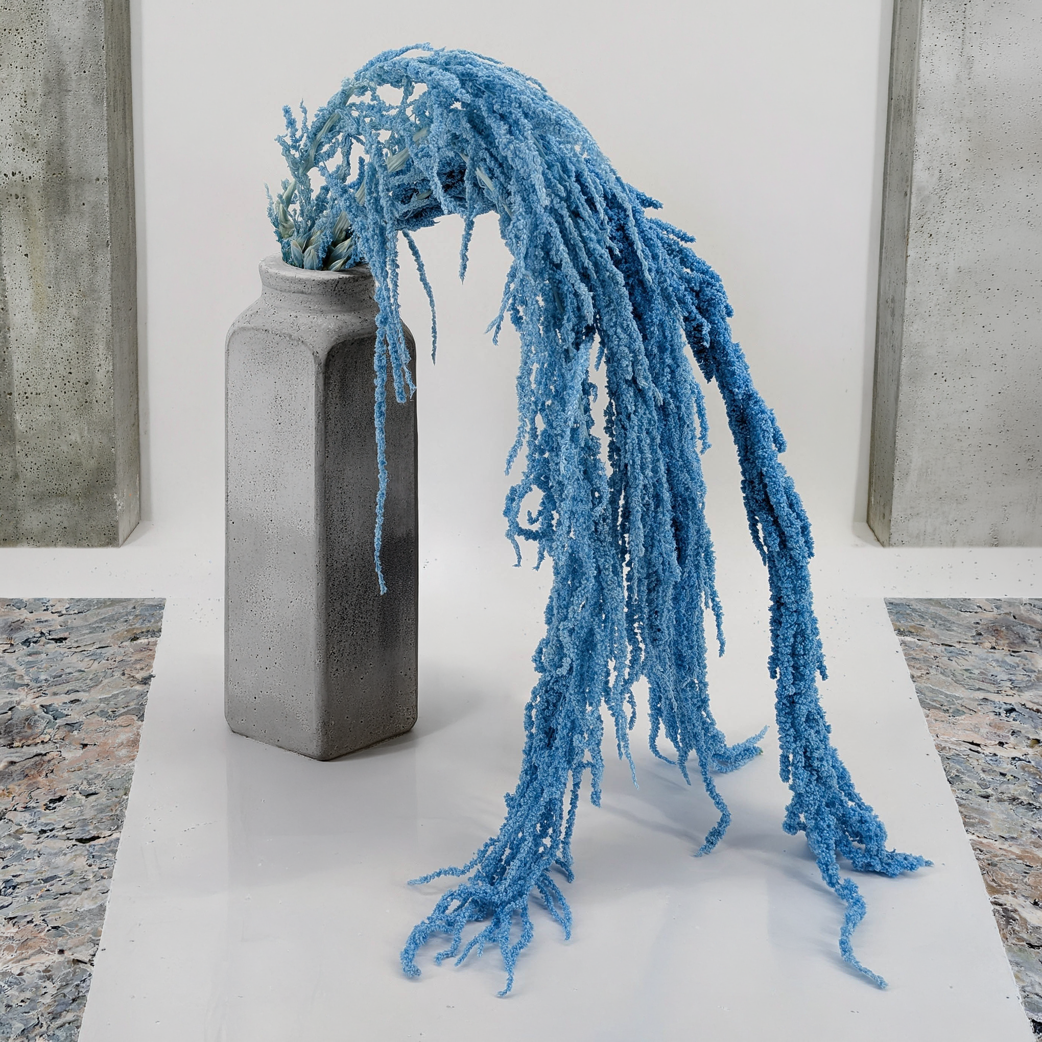 Royal preserved amaranthus in light blue is a decorative plant with long cascading tassels. The soft blue shade adds freshness and elegance to floral arrangements and interior decorations.