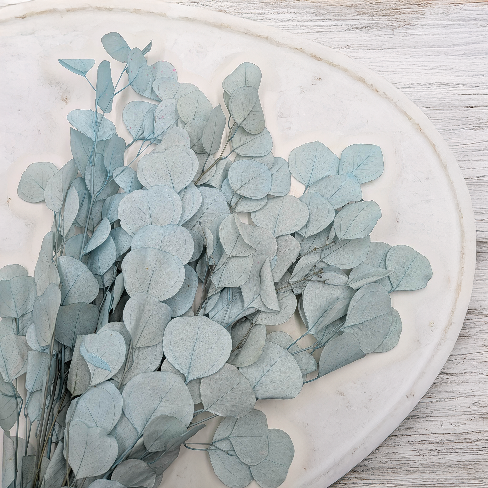 Light blue eucalyptus pairs beautifully with preserved white gypsophila, bleached lagurus, hydrangea, dried lavender and natural ornamental grasses.