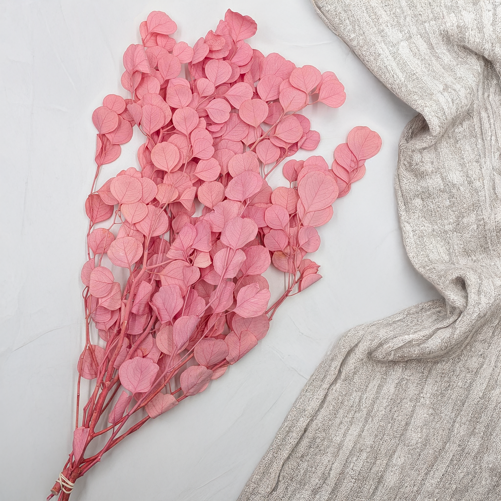 Pink Populus Royal eucalyptus pairs beautifully with preserved cream gypsophila, bleached lagurus, light hydrangea, dried lavender and natural ornamental grasses. It also combines perfectly with beige, white, gold accents and soft pastel tones.