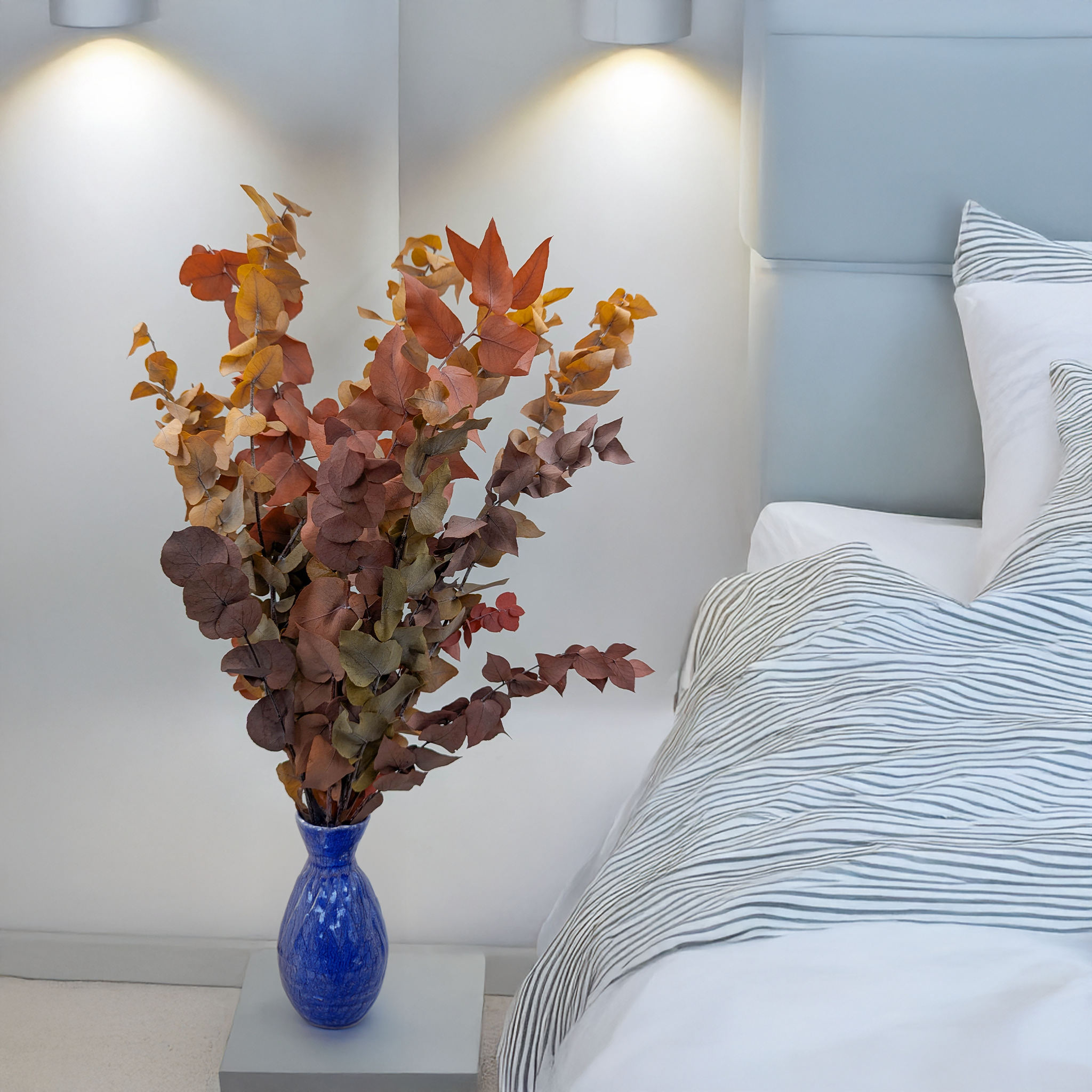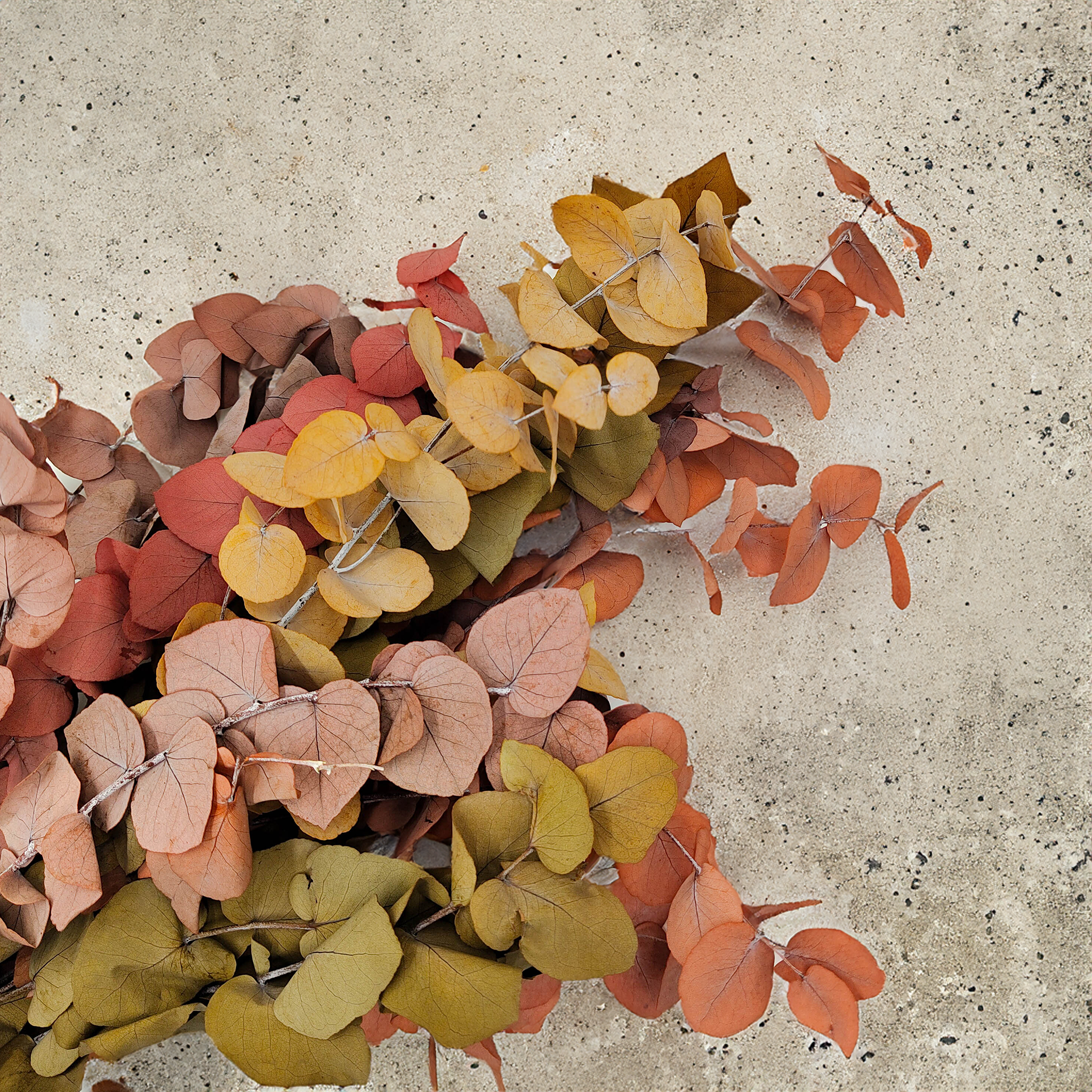 The Autumn MIX Stuartiana eucalyptus is a vibrant combination of warm seasonal colors – including deep red, burnt orange, and golden yellow. Its rounded leaves and rich tones make it perfect for fall wreaths, boho floral arrangements, interior styling, and creative DIY projects. Whether used as a focal point or background accent, it adds warmth and character.